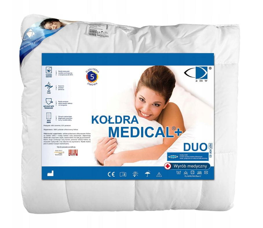 Kołdra Duo Medical w rozmiarze 180x200 cm (szerokość x długość) składa się z dwóch warstw zszytych razem. Powstała w ten sposób pomiędzy kołdrami przestrzeń stanowi dodatkową warstwę termoizolacyjną. Uszyta została z tkaniny składającej się z 48% bawełny i z 52% poliesteru Wypełniono ją 100% poliestrem silikonowanym Hollow, który zapewnia doskonałą cyrkulację powietrza oraz wpływa na puszystość i sprężystość produktu. Specjalne pikowanie kołdry zapewnia równomierne rozłożenie ciepła, redukujące różnice i zimne strefy.