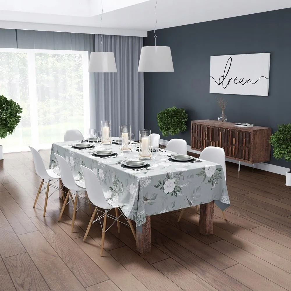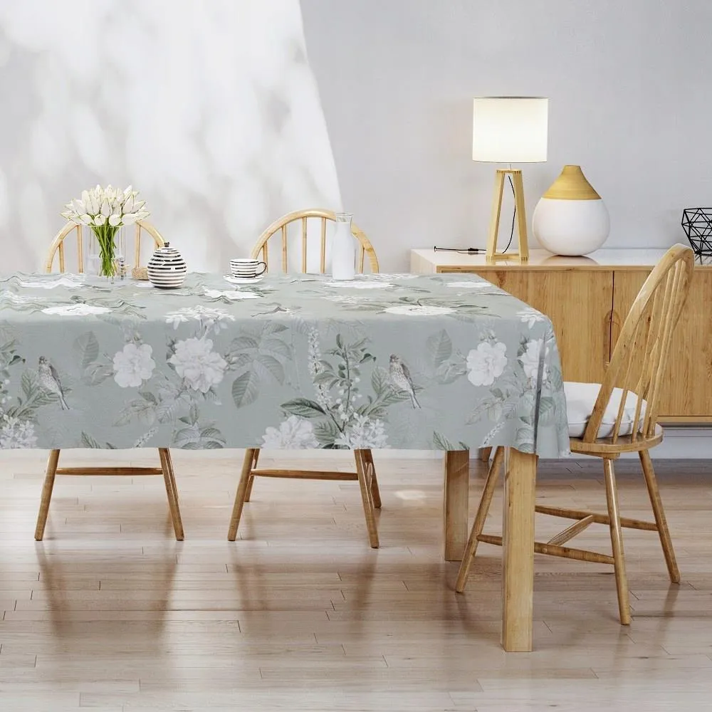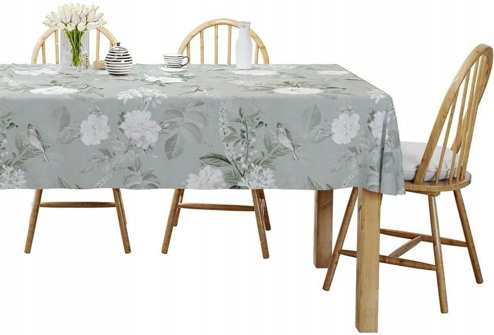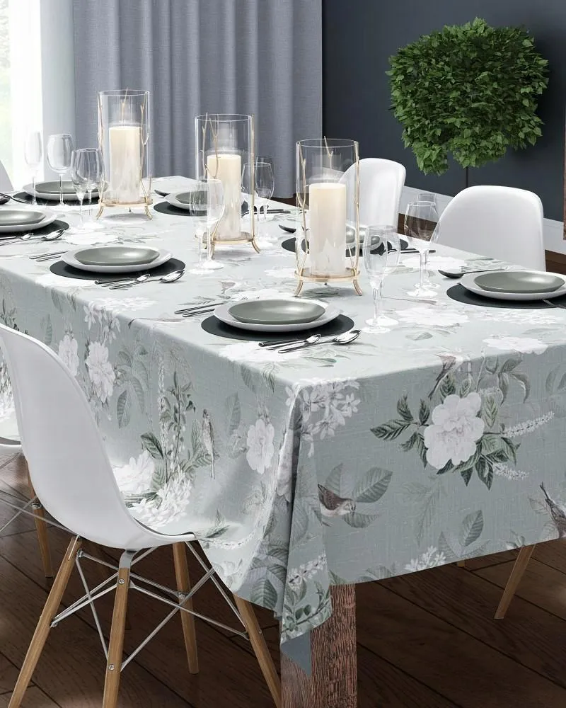 Szałwiowy Obrus Bawełniany 140x280 cm z Nadrukiem Kwiatów, Ptaków i Liści – 4271A – Subtelna Elegancja Na Twoim Stole
