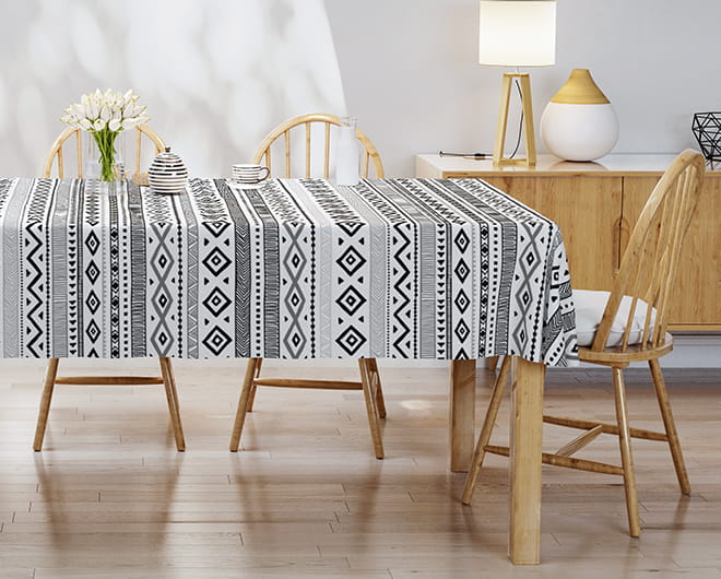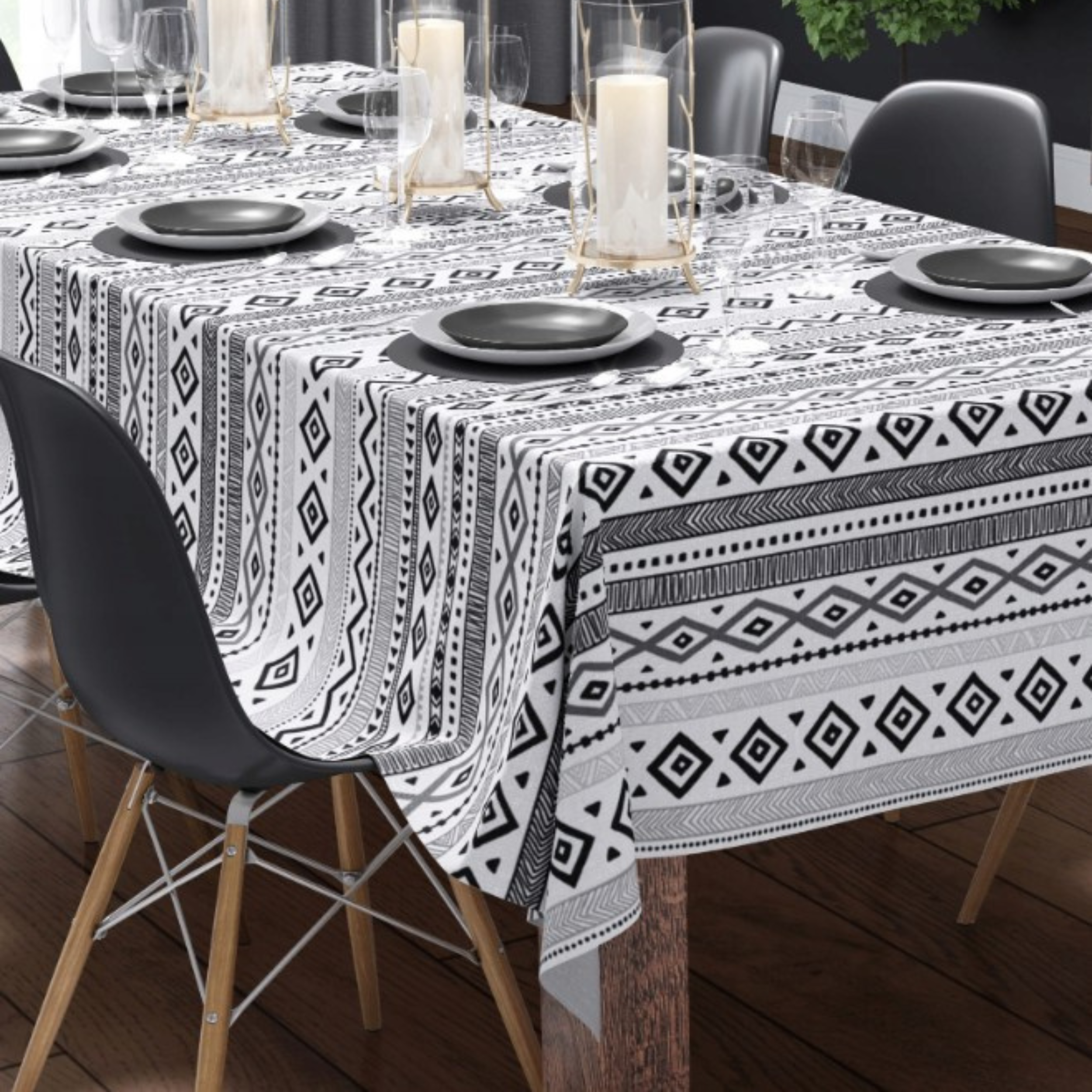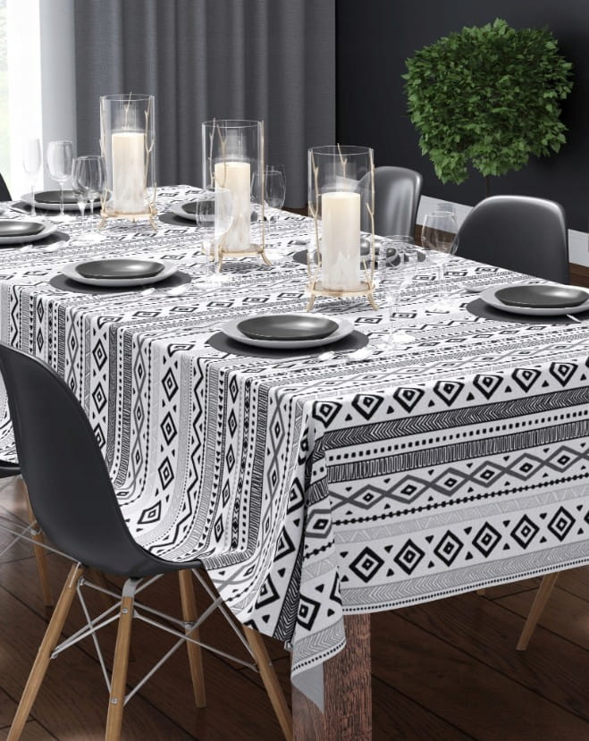 Biały Obrus Bawełniany 140x280 cm z Czarnym Nadrukiem Geometrycznym – 4276A – Subtelna Elegancja Na Twoim Stole