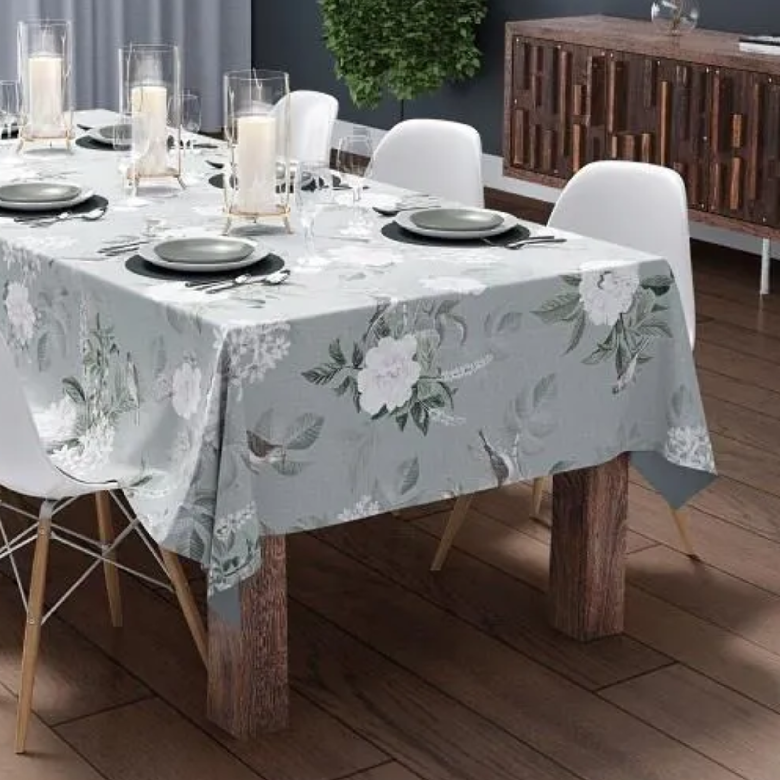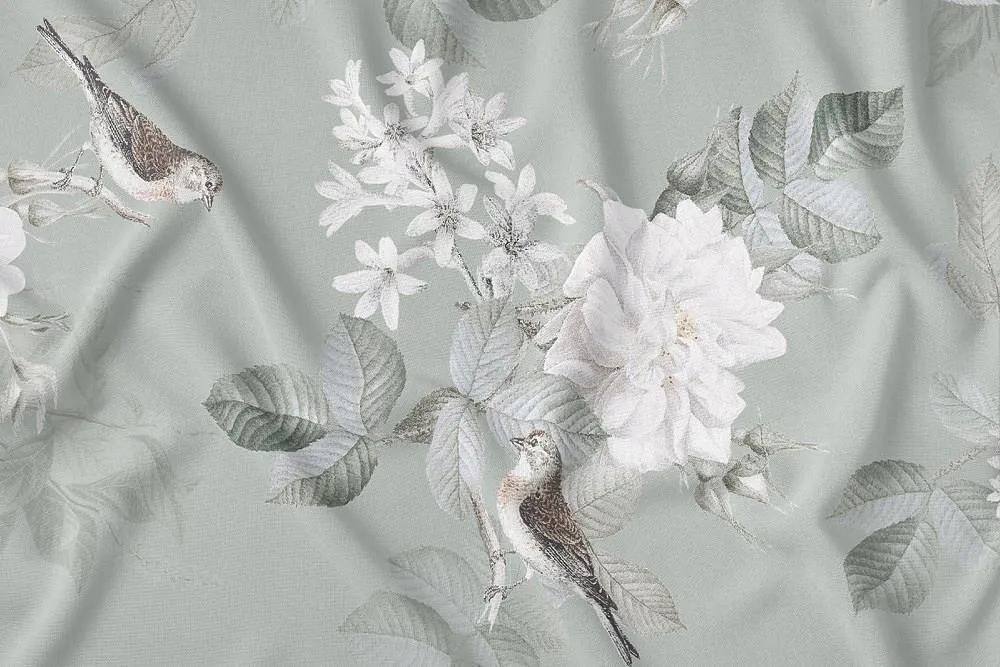 Szałwiowy Obrus Bawełniany 140x320 cm z Nadrukiem Kwiatów, Ptaków i Liści – 4271A – Subtelna Elegancja Na Twoim Stole