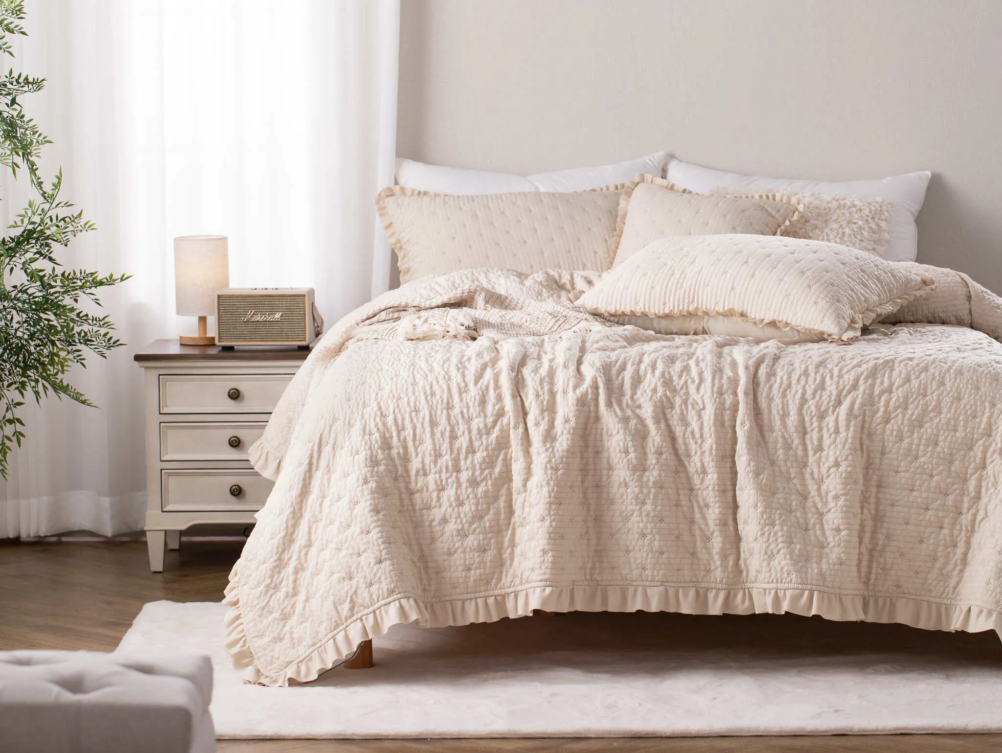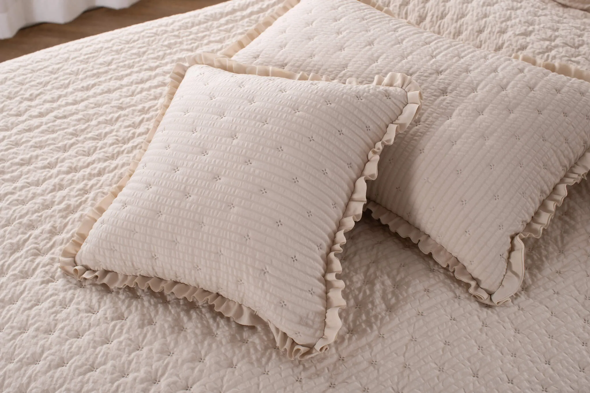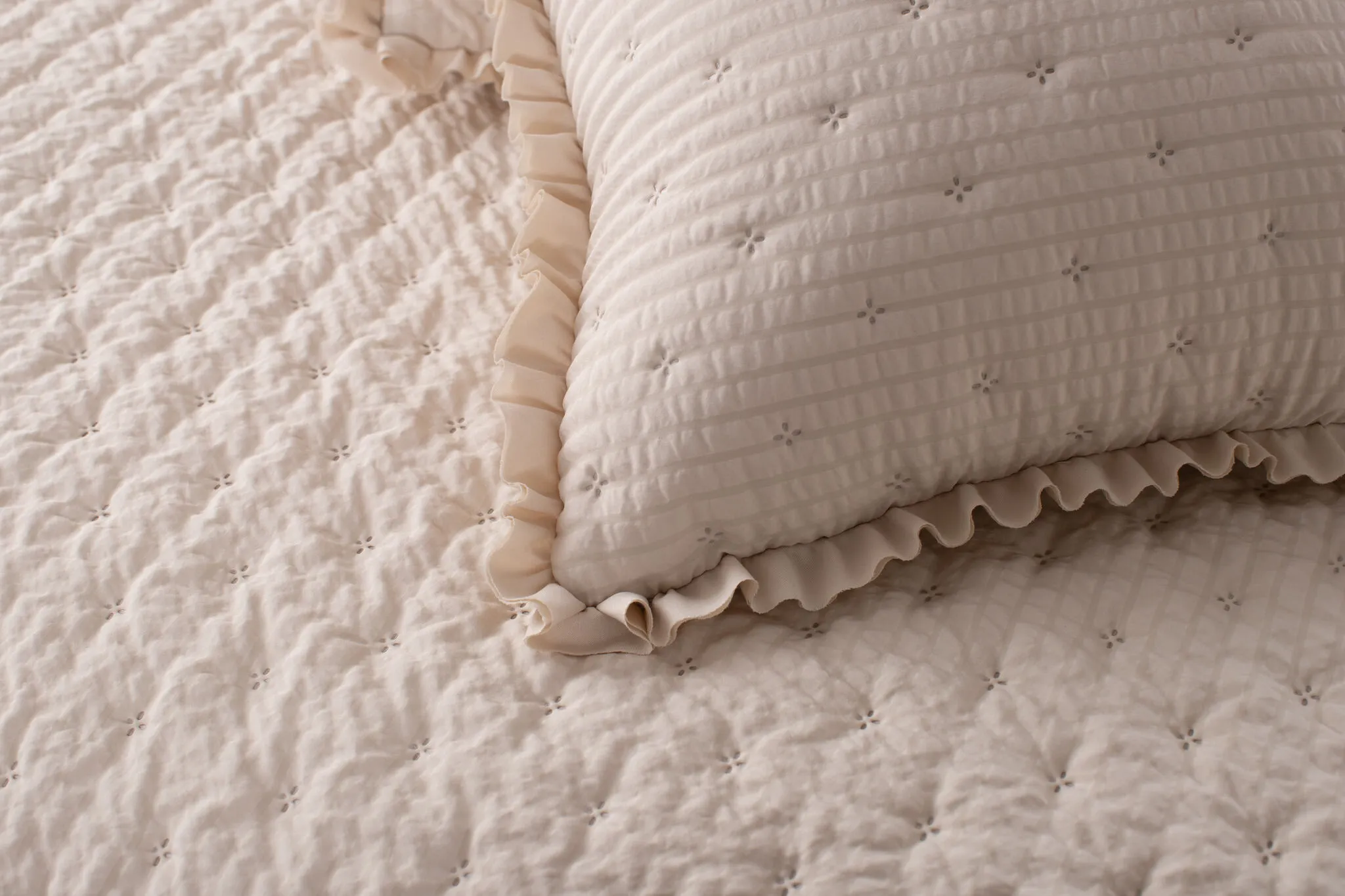 Beżowa narzuta na łóżko z pikowaniem i falbanką z mikrofibry imitującej korę Amour