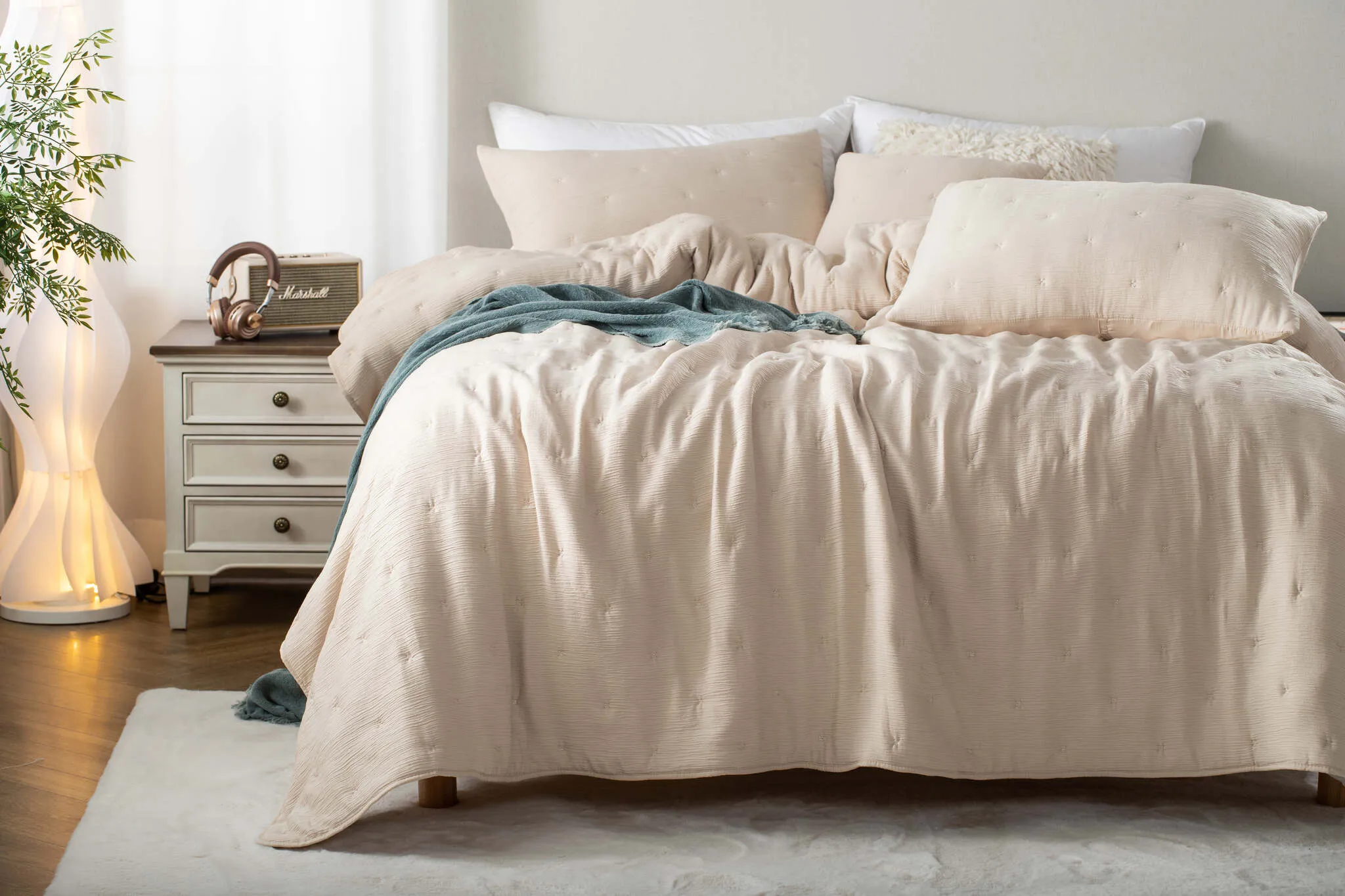 Beżowa narzuta na łóżko z muślinowym marszczeniem z mikrofibry Stella