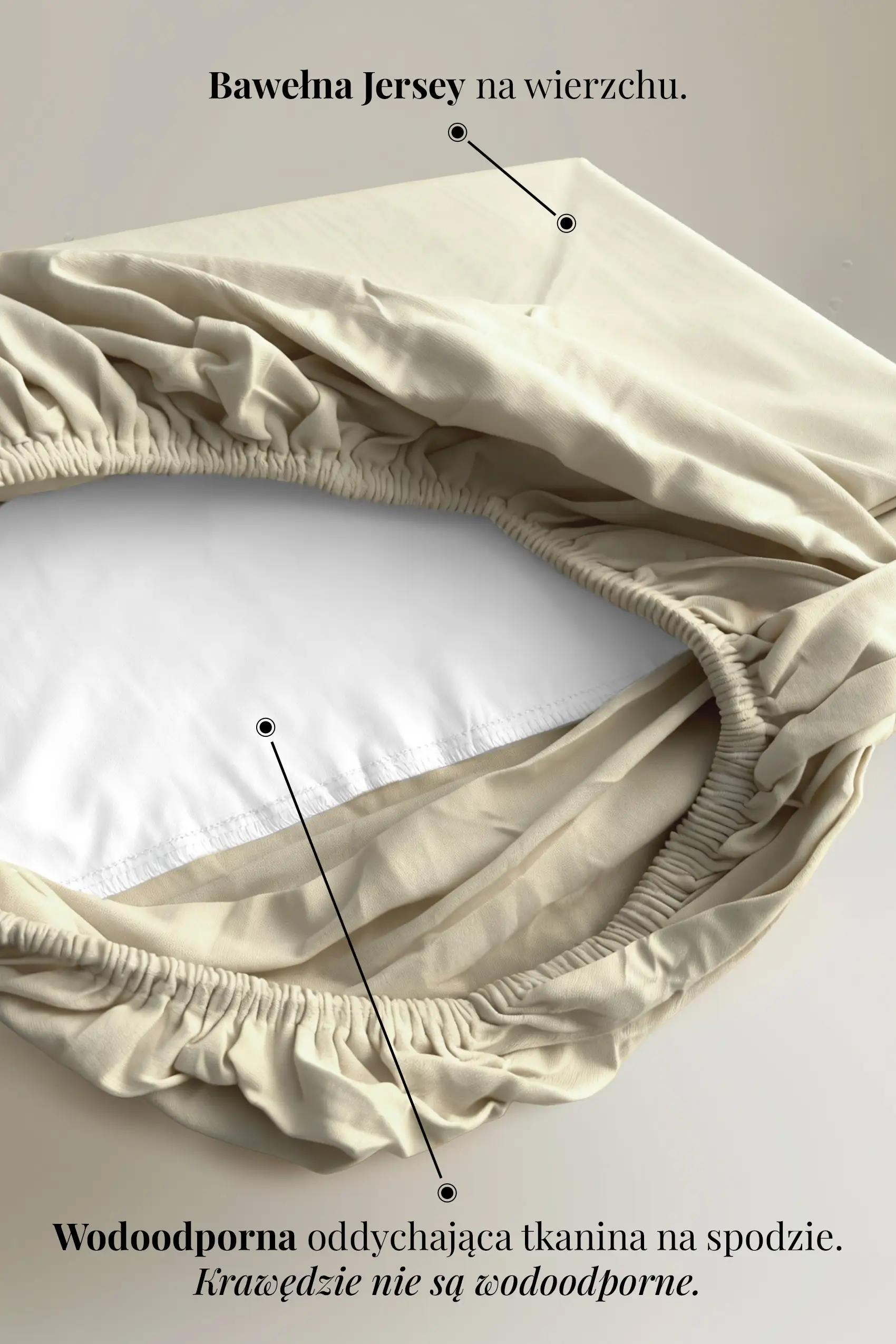 Uwaga: wodoodporna jest górna powierzchnia prześcieradła. Boki nie są wodoodporne – dzięki temu zachowują miękkość i elastyczność klasycznego prześcieradła.