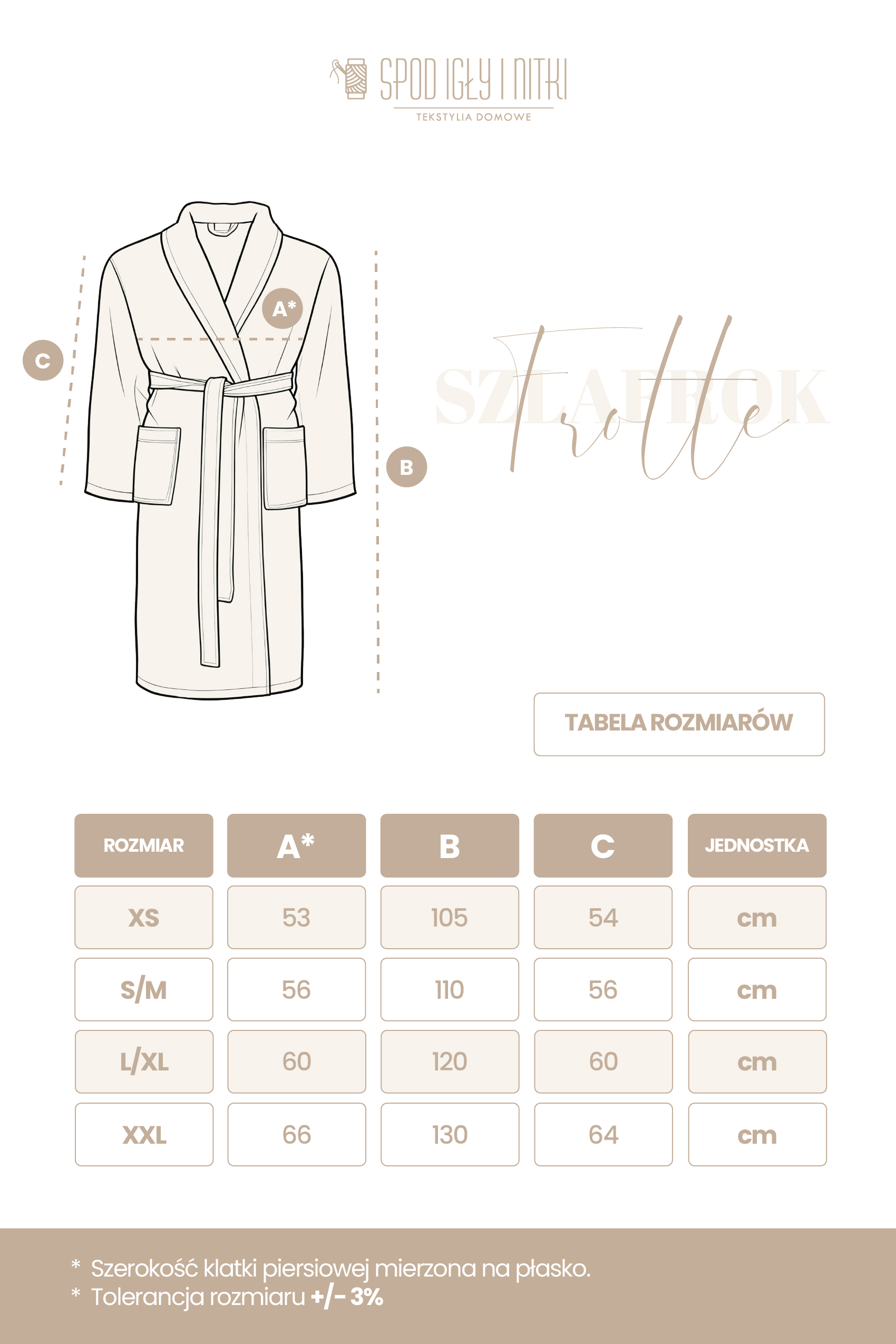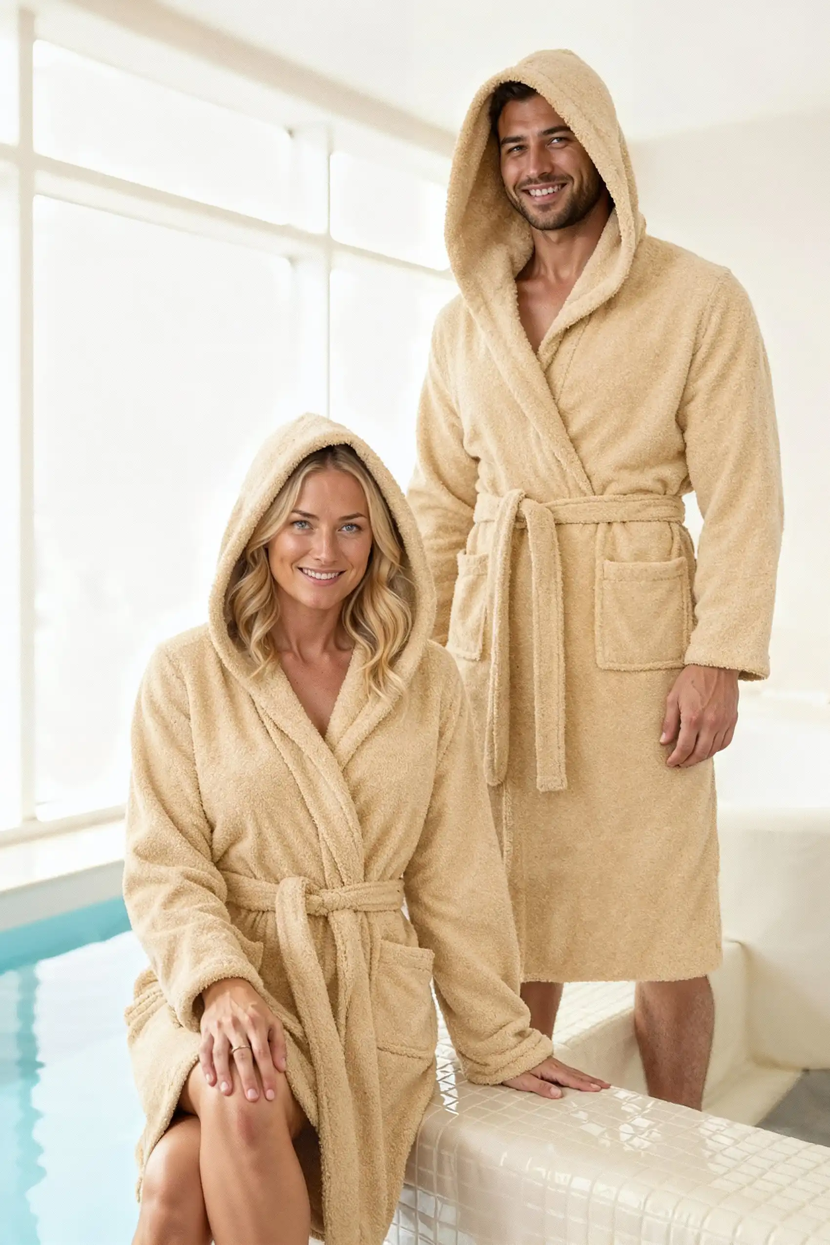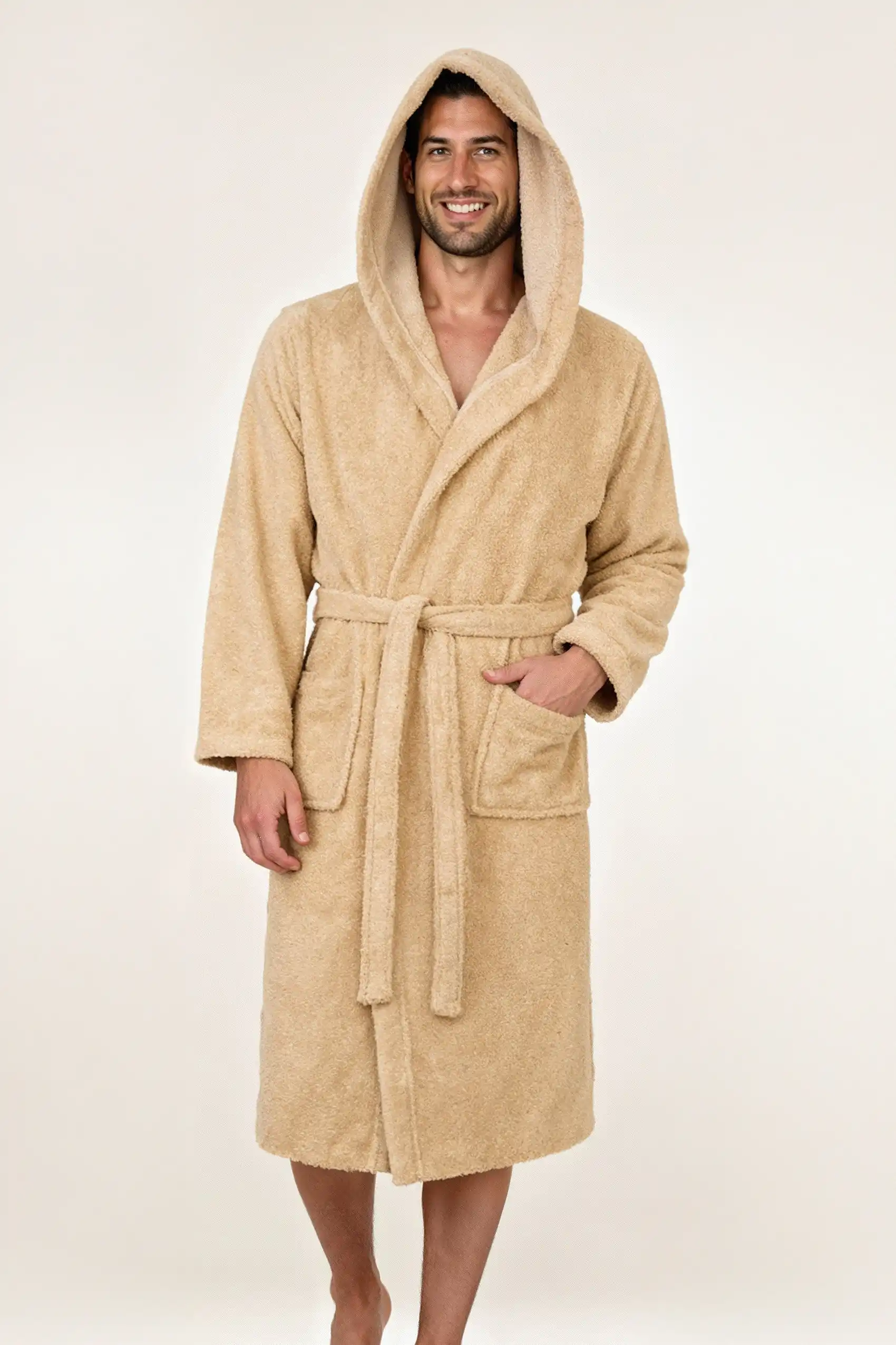 Szlafrok Robin to kwintesencja komfortu i otulenia. Uszyty z 100% bawełny frotte o wysokiej gramaturze 450 g/m², zapewnia wyjątkową miękkość i chłonność. Beżowy kolor podkreśla jego elegancki charakter, a praktyczne detale, takie jak kaptur i kieszenie, czynią go doskonałym wyborem na każdy dzień. Dzięki luźnemu krojowi unisex idealnie pasuje zarówno kobietom, jak i mężczyznom. To szlafrok, który pozwoli Ci poczuć domowe SPA w każdej chwili.