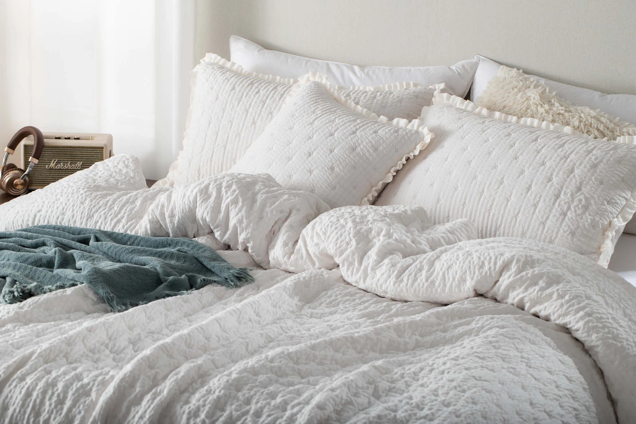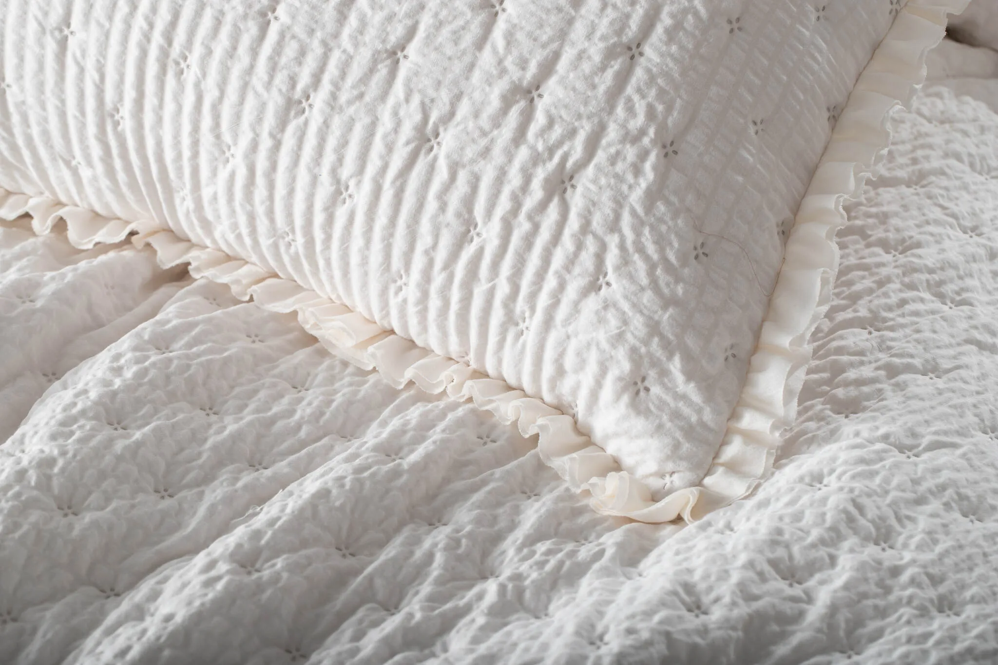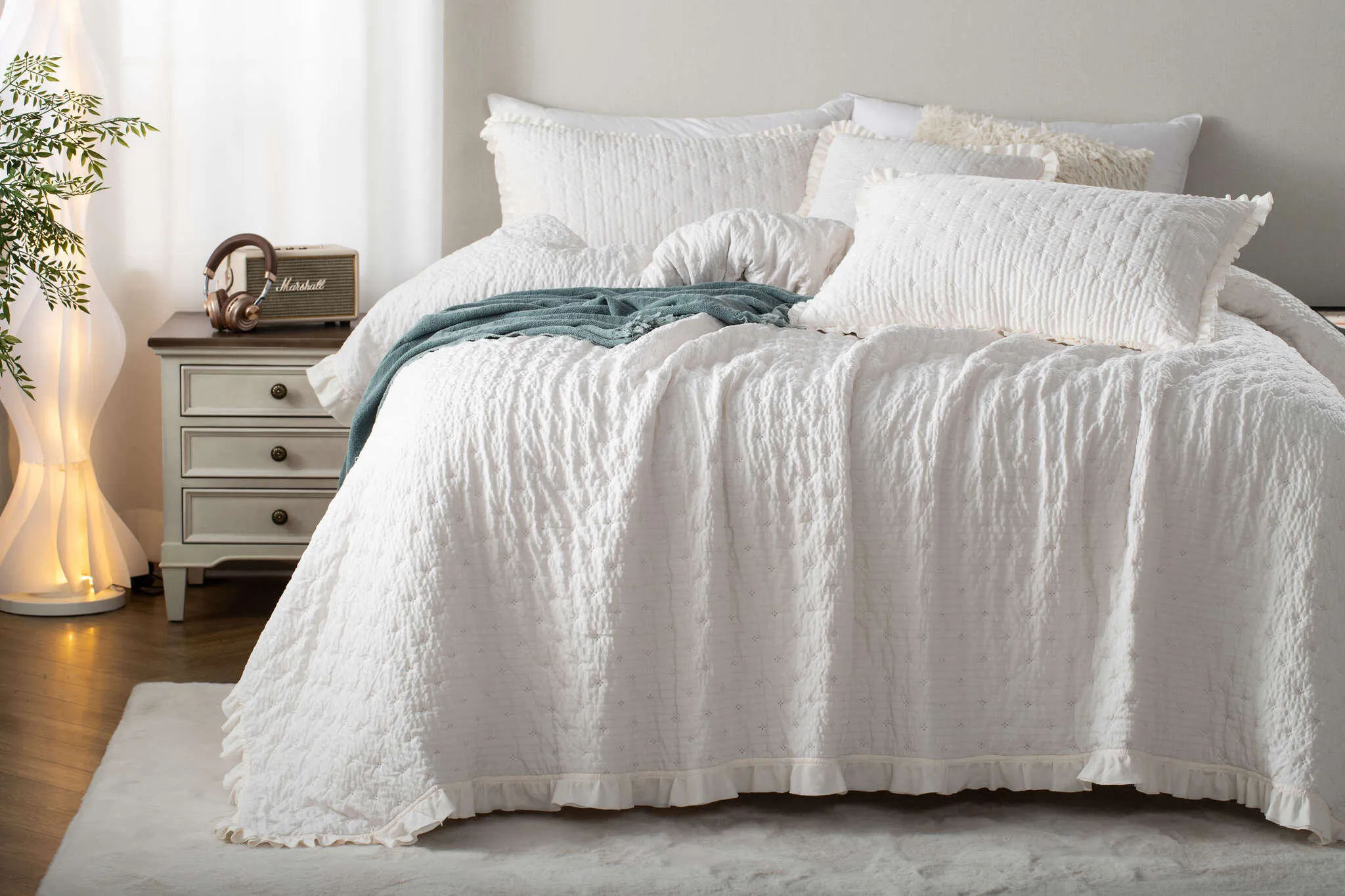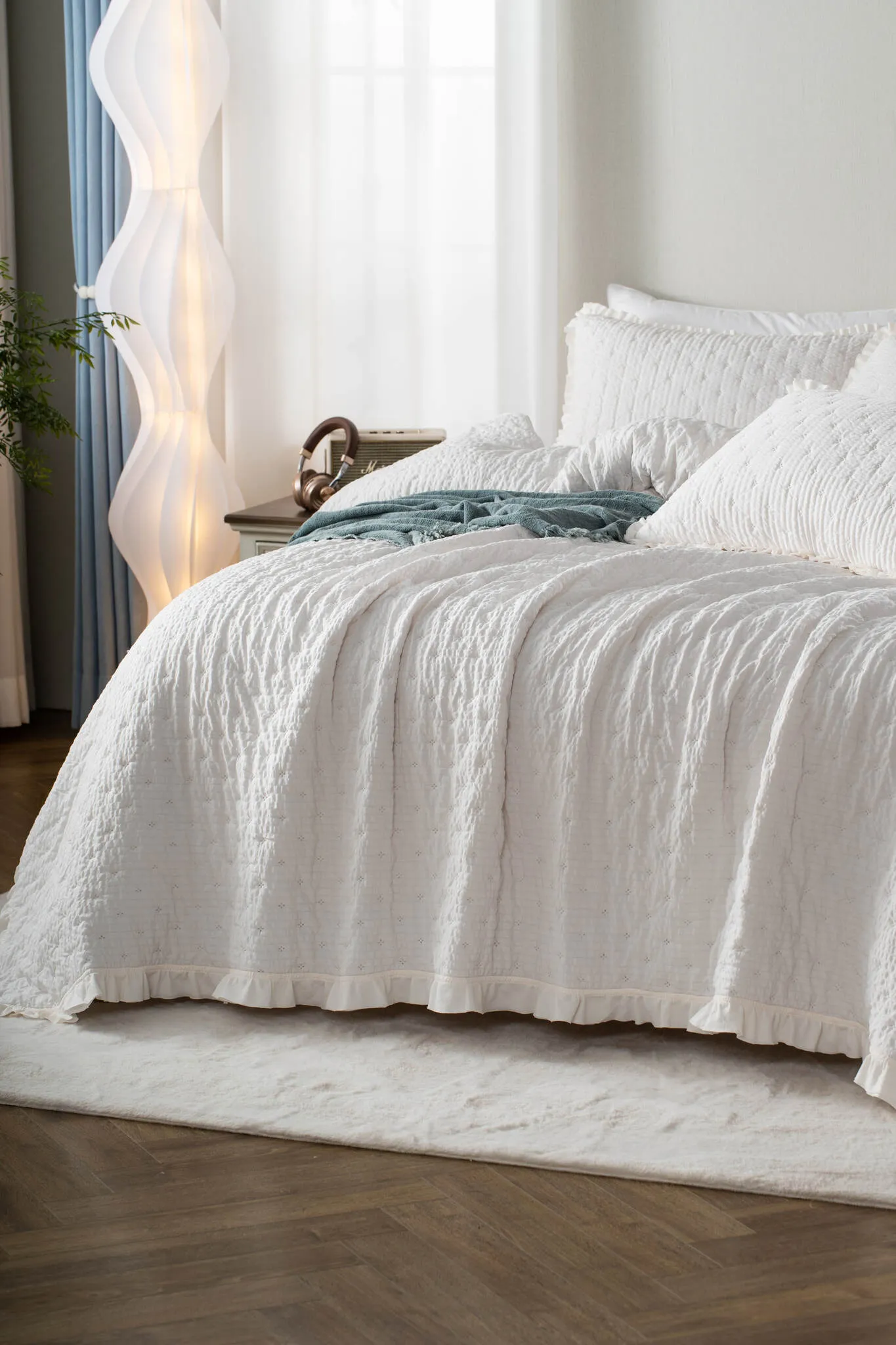 Biała narzuta na łóżko z pikowaniem i falbanką z mikrofibry imitującej korę Amour