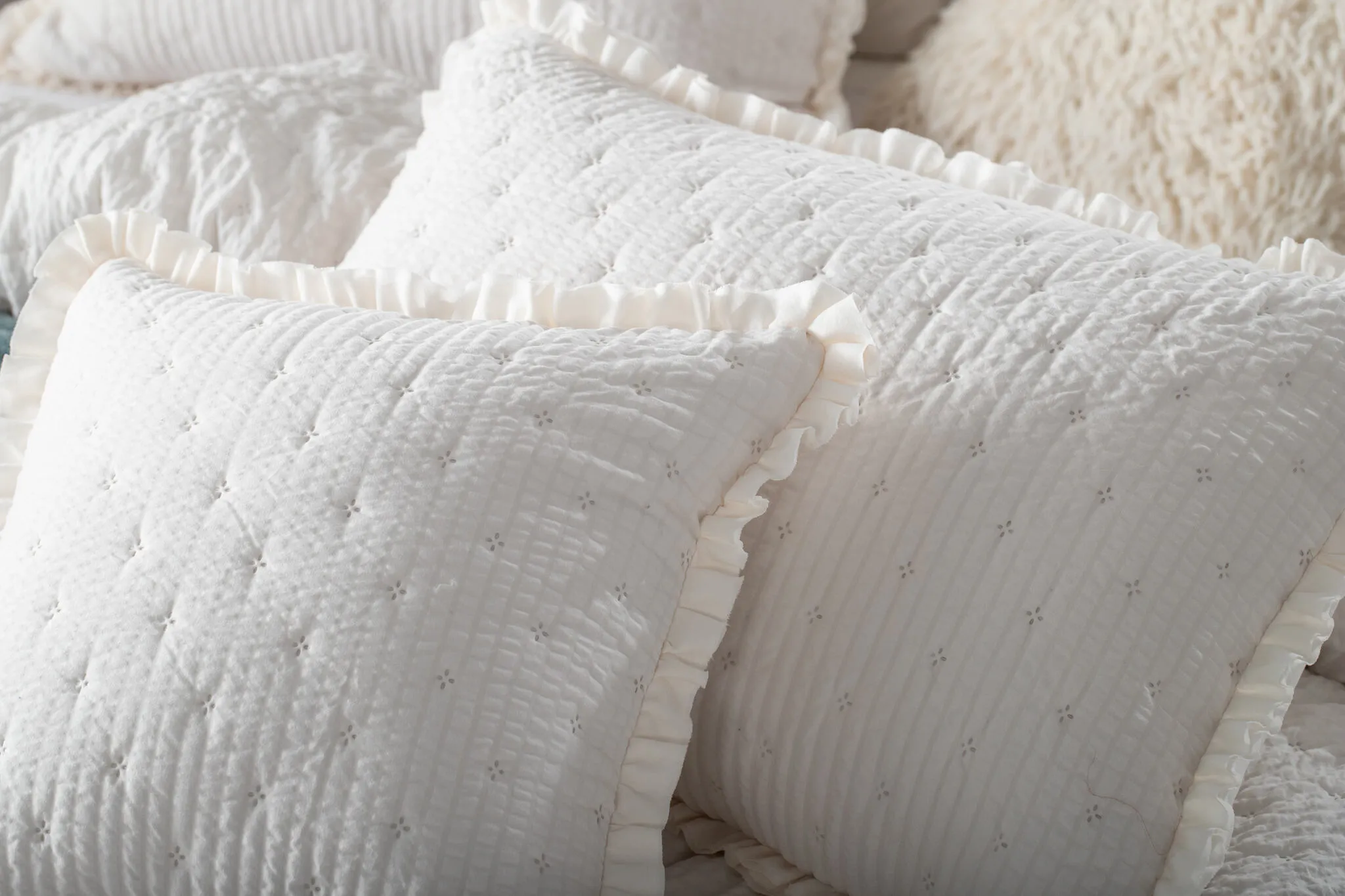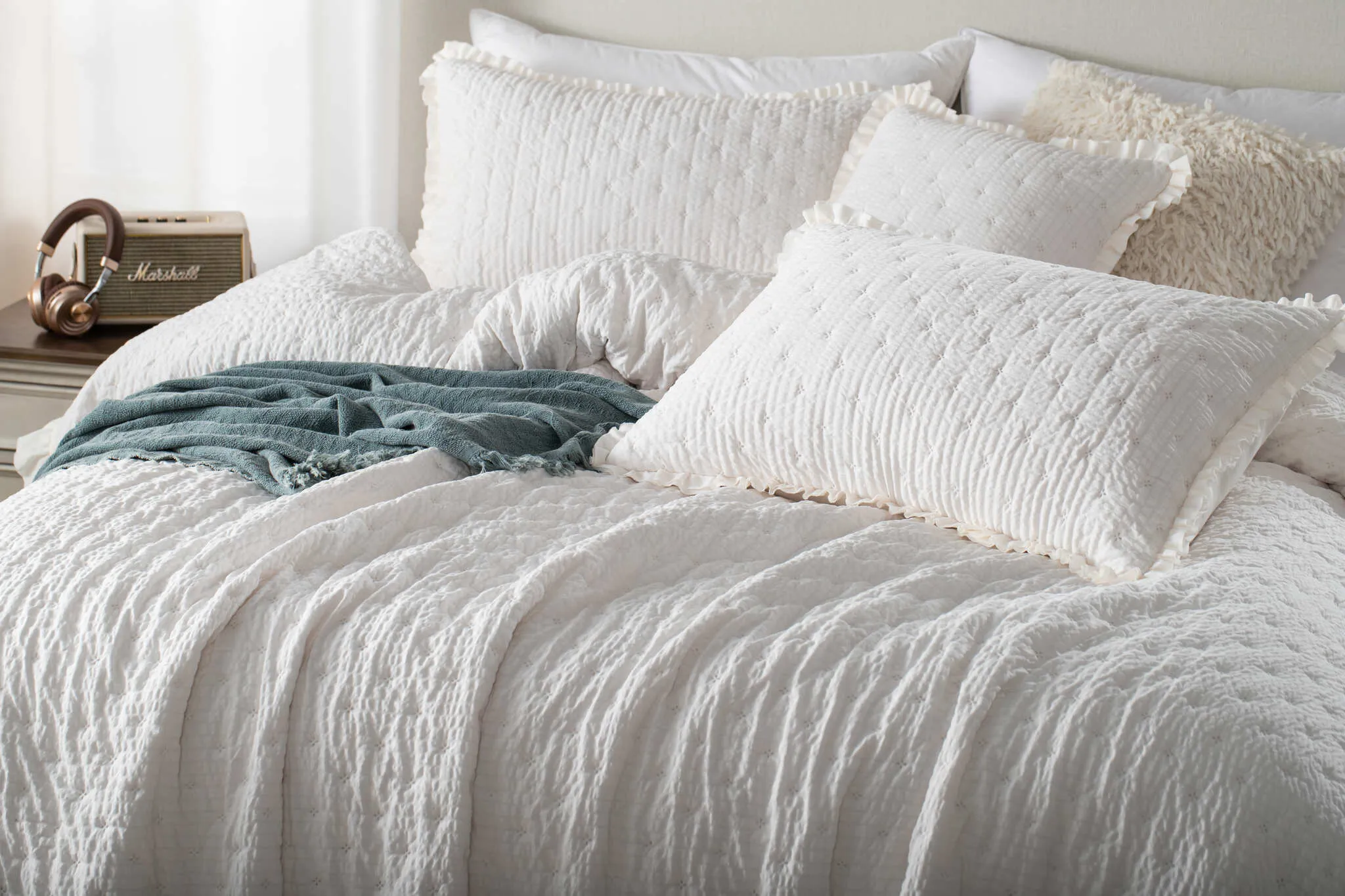 Biała narzuta na łóżko z pikowaniem i falbanką z mikrofibry imitującej korę Amour