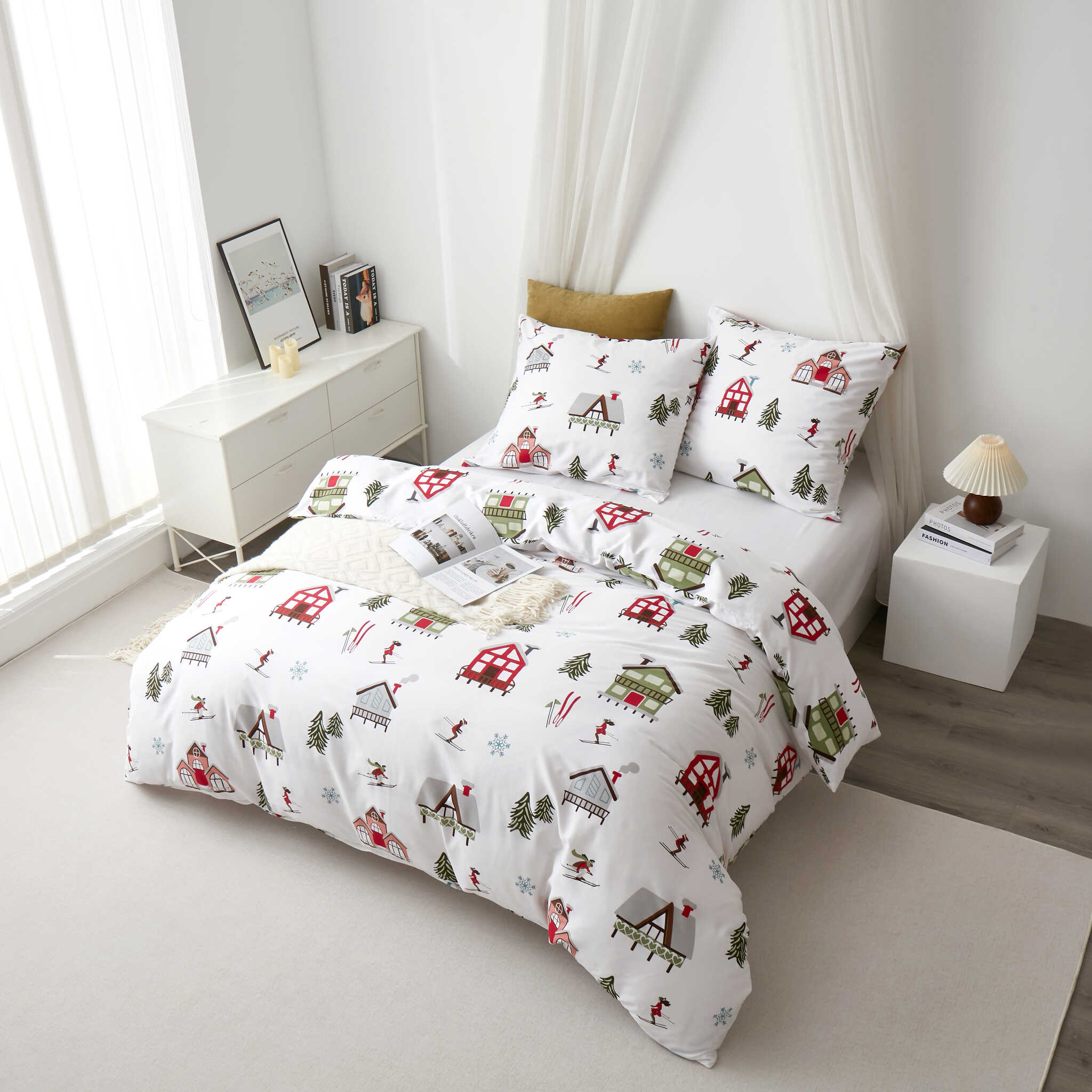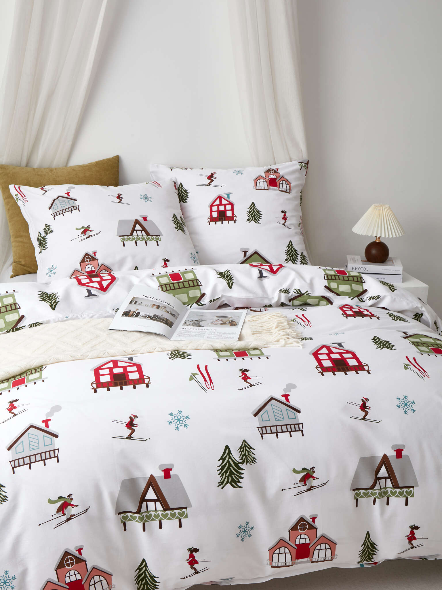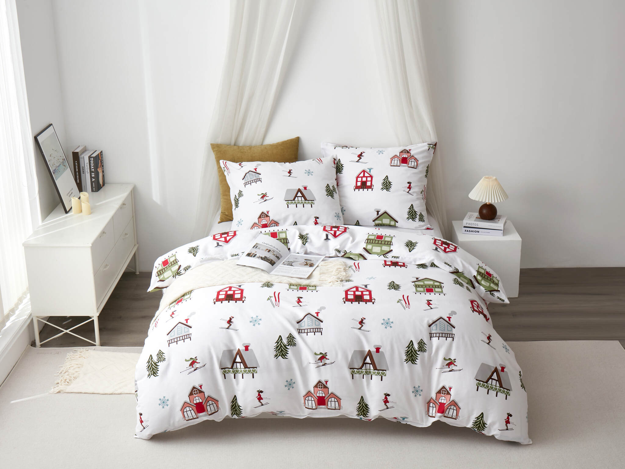 Wprowadź do swojej sypialni magiczny, świąteczny klimat, który otuli Cię nie tylko ciepłem, ale też wyjątkowym stylem. Nasz komplet pościeli Skiing z bawełny o satynowym splocie łączy w sobie subtelność, elegancję i funkcjonalność. Śnieżnobiała baza została ozdobiona uroczym motywem narciarzy, śnieżynek, choinek i domków narciarskich które dodają jej uroku oraz tworzą przytulną atmosferę. Całość dopełnia praktyczne zapięcie na zamek błyskawiczny, które ułatwia codzienne użytkowanie.