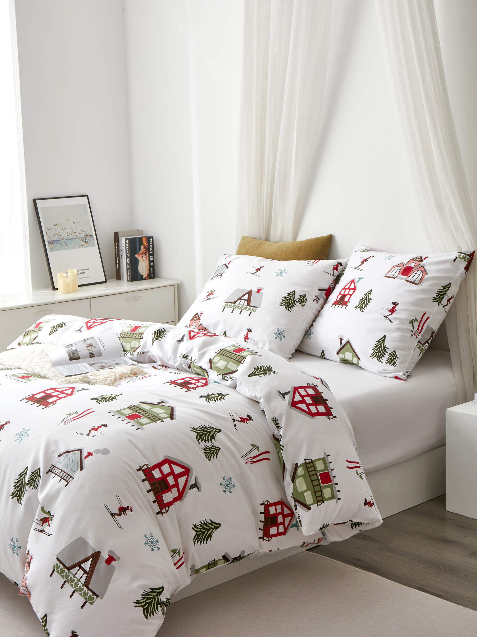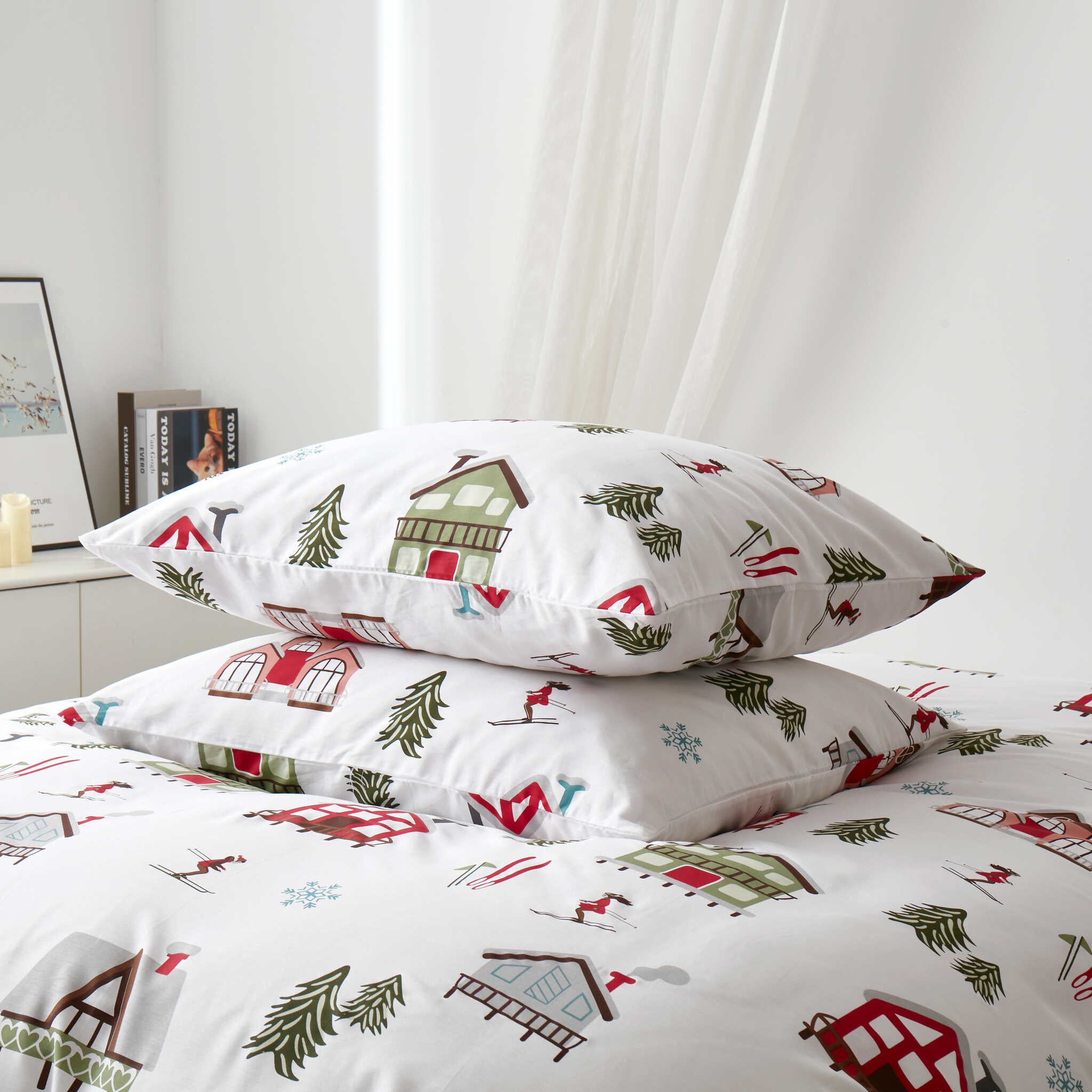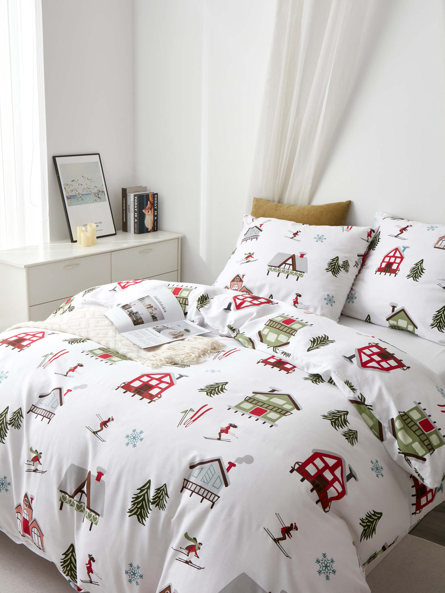 Wprowadź do swojej sypialni magiczny, świąteczny klimat, który otuli Cię nie tylko ciepłem, ale też wyjątkowym stylem. Nasz komplet pościeli Skiing z bawełny o satynowym splocie łączy w sobie subtelność, elegancję i funkcjonalność. Śnieżnobiała baza została ozdobiona uroczym motywem narciarzy, śnieżynek, choinek i domków narciarskich które dodają jej uroku oraz tworzą przytulną atmosferę. Całość dopełnia praktyczne zapięcie na zamek błyskawiczny, które ułatwia codzienne użytkowanie.