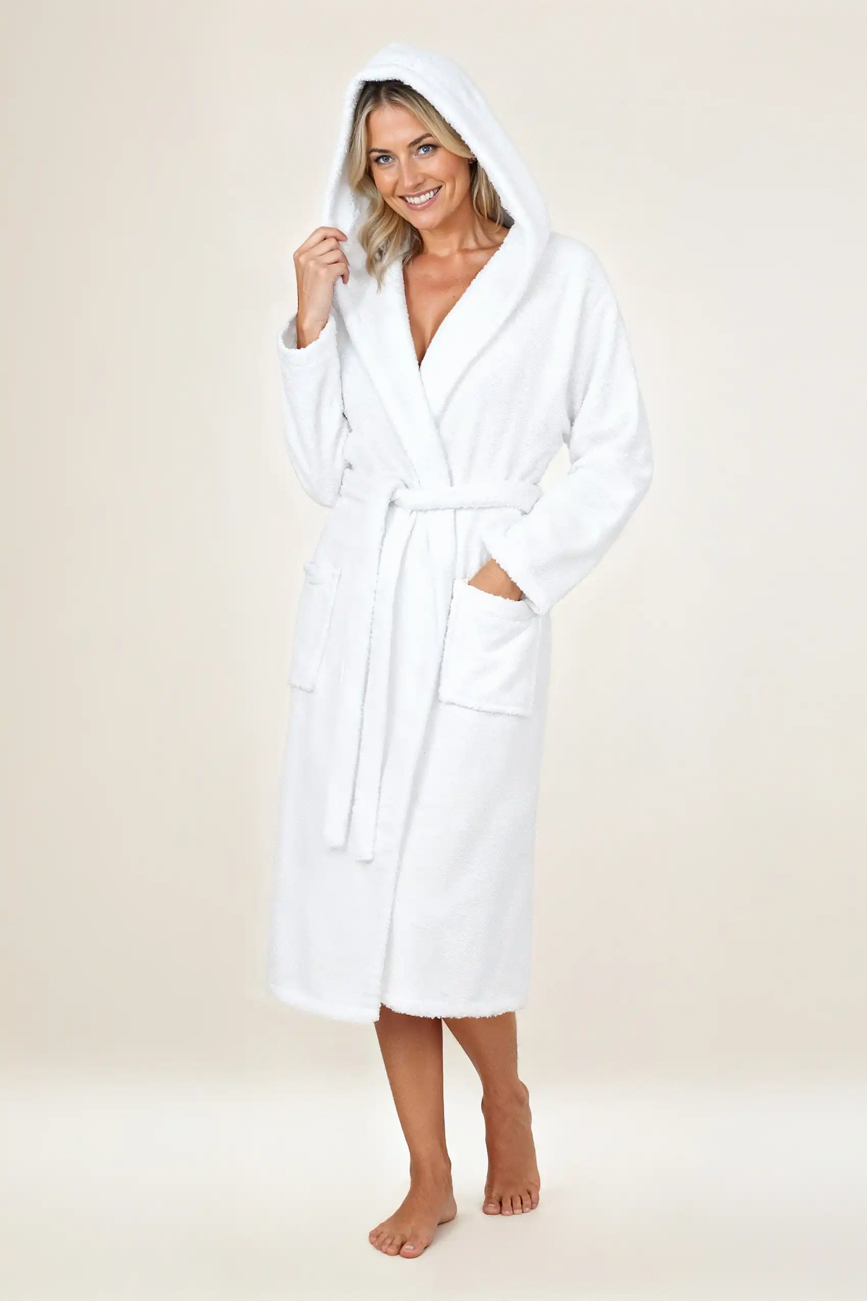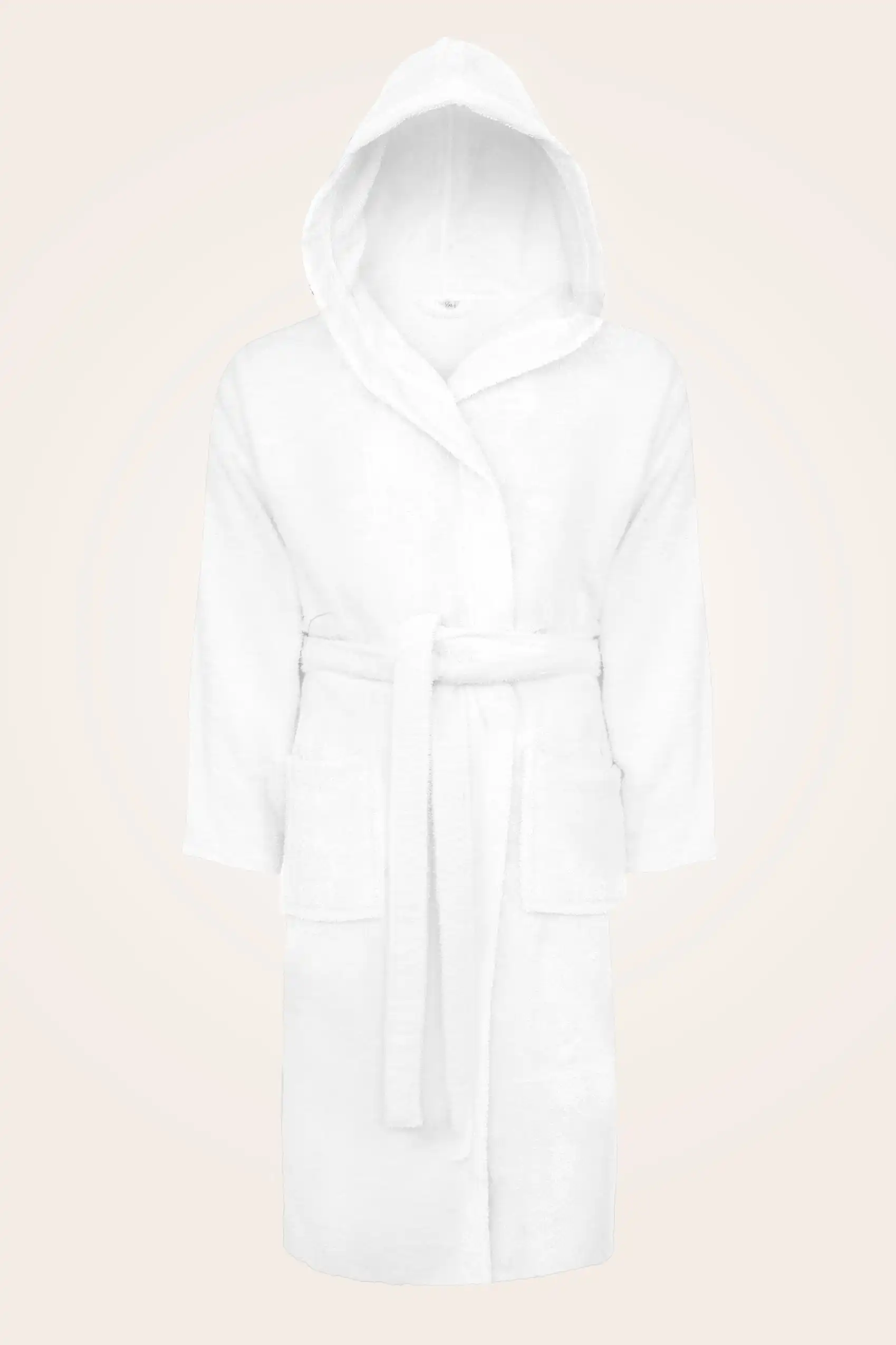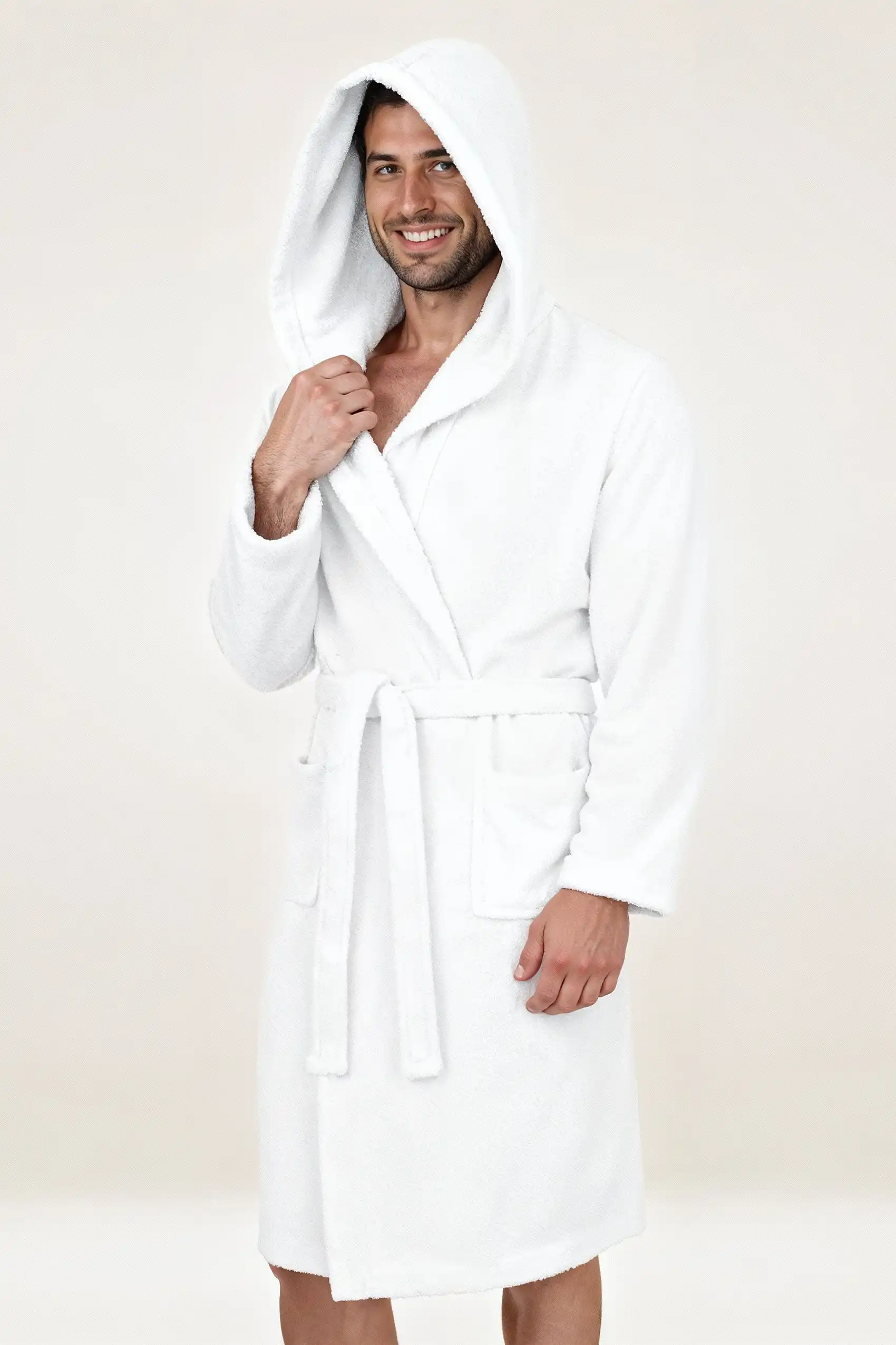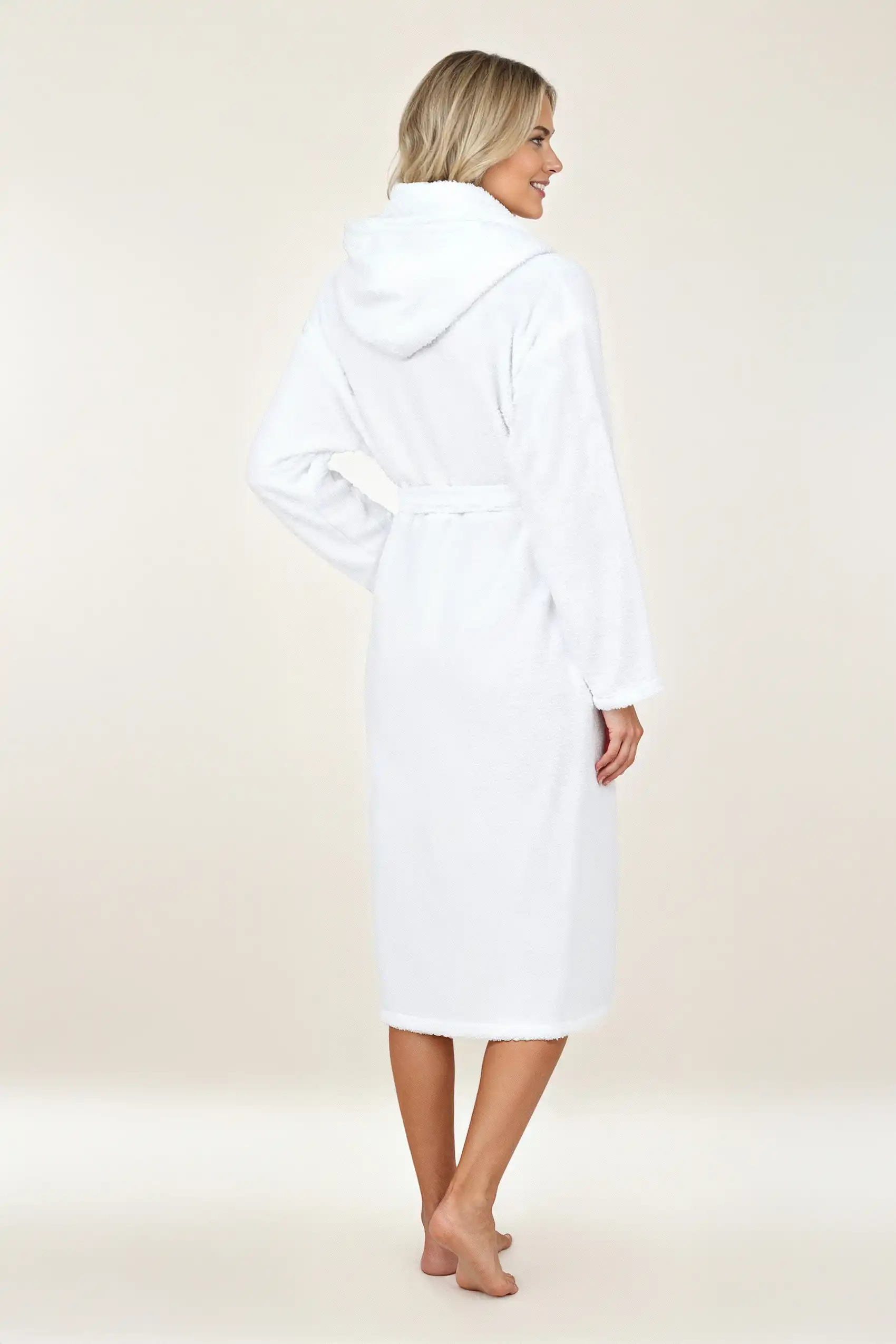 Biały szlafrok unisex z kapturem z grubej bawełny frotte 450 g/m² – kolekcja Robin