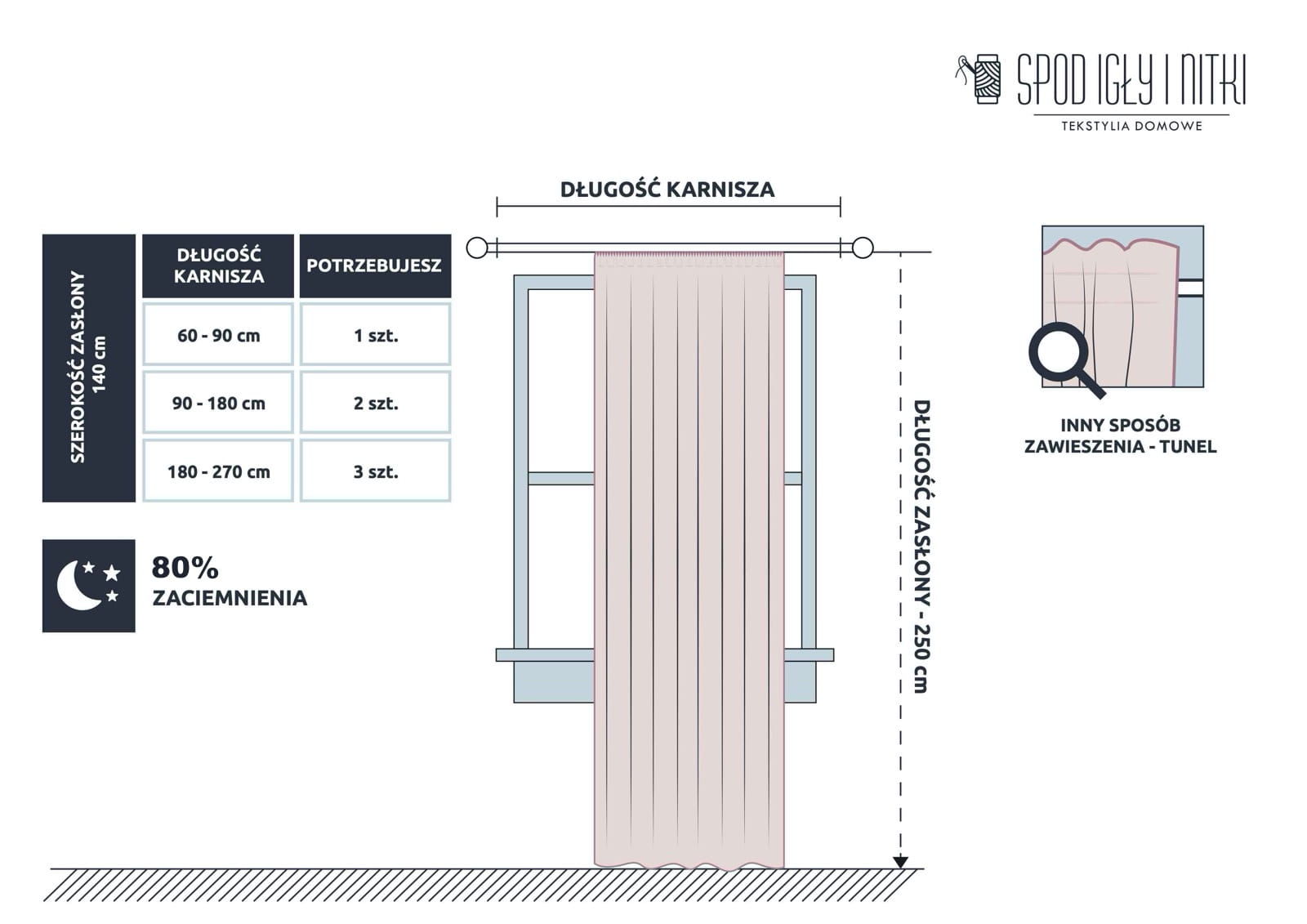 - Przelotki: 8 sztuk, średnica 4 cm / Taśma marszcząca – uniwersalne mocowanie