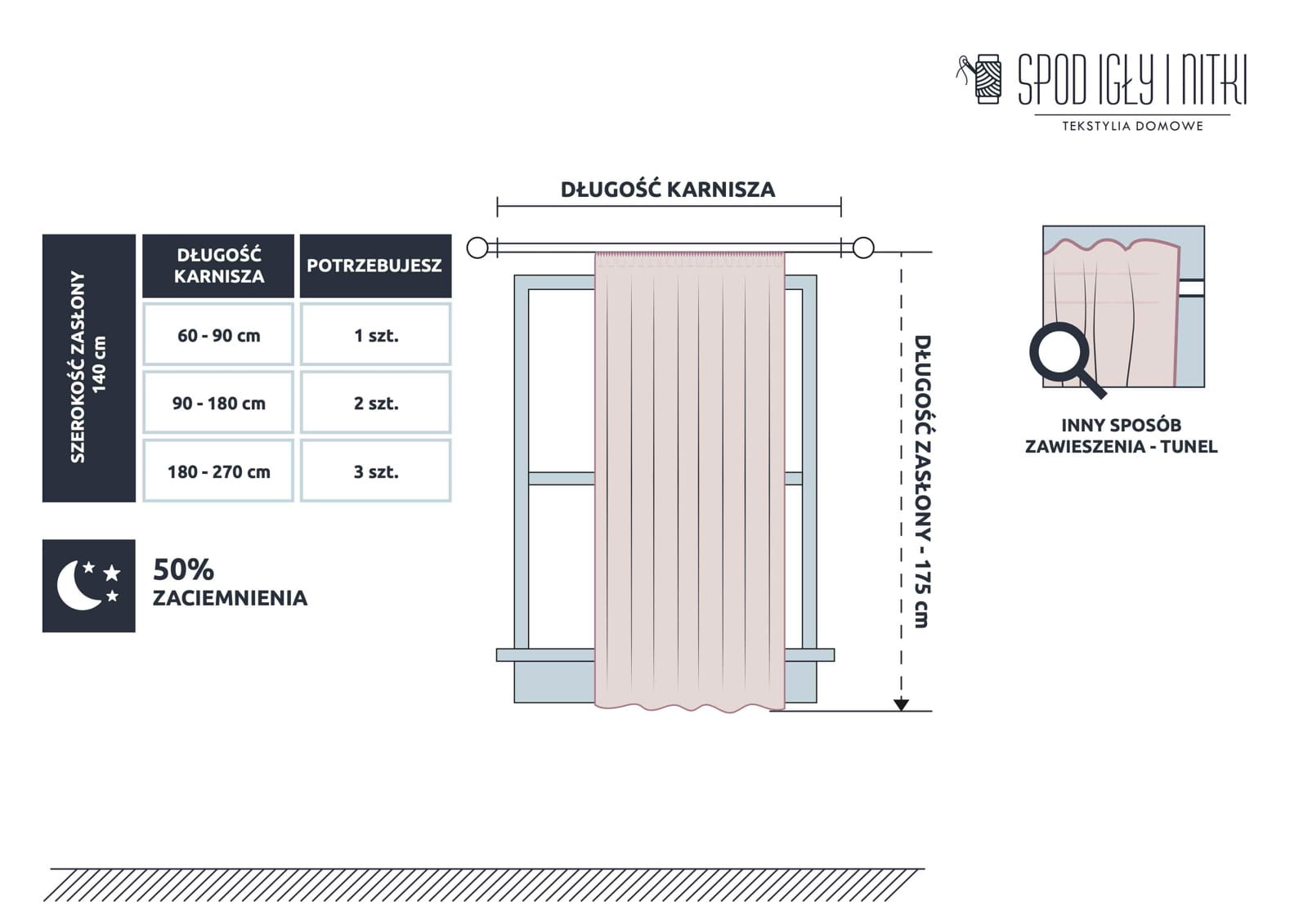 Kolekcja VIVA została zaprojektowana z myślą o różnych typach pomieszczeń i okien. Wersja kuchenna 140x175 cm doskonale sprawdzi się w mniejszych przestrzeniach, zapewniając lekkość i funkcjonalność. Modele 140x250 cm na przelotkach to idealne rozwiązanie do nowoczesnych aranżacji, gdzie liczy się szybkie zawieszenie i estetyczny układ tkaniny. Warianty 140x270 cm oraz 140x300 cm na taśmie pozwalają na większą swobodę stylizacji i regulację marszczenia. Dzięki temu możesz dopasować zasłonę do wysokości pomieszczenia oraz efektu, jaki chcesz uzyskać. Taśma daje możliwość uzyskania bardziej dekoracyjnego marszczenia, natomiast przelotki tworzą równe, nowoczesne fale. To rozwiązanie, które łączy wygodę i estetykę. Każdy wariant został dopracowany tak, aby zasłona prezentowała się elegancko niezależnie od sposobu montażu.
