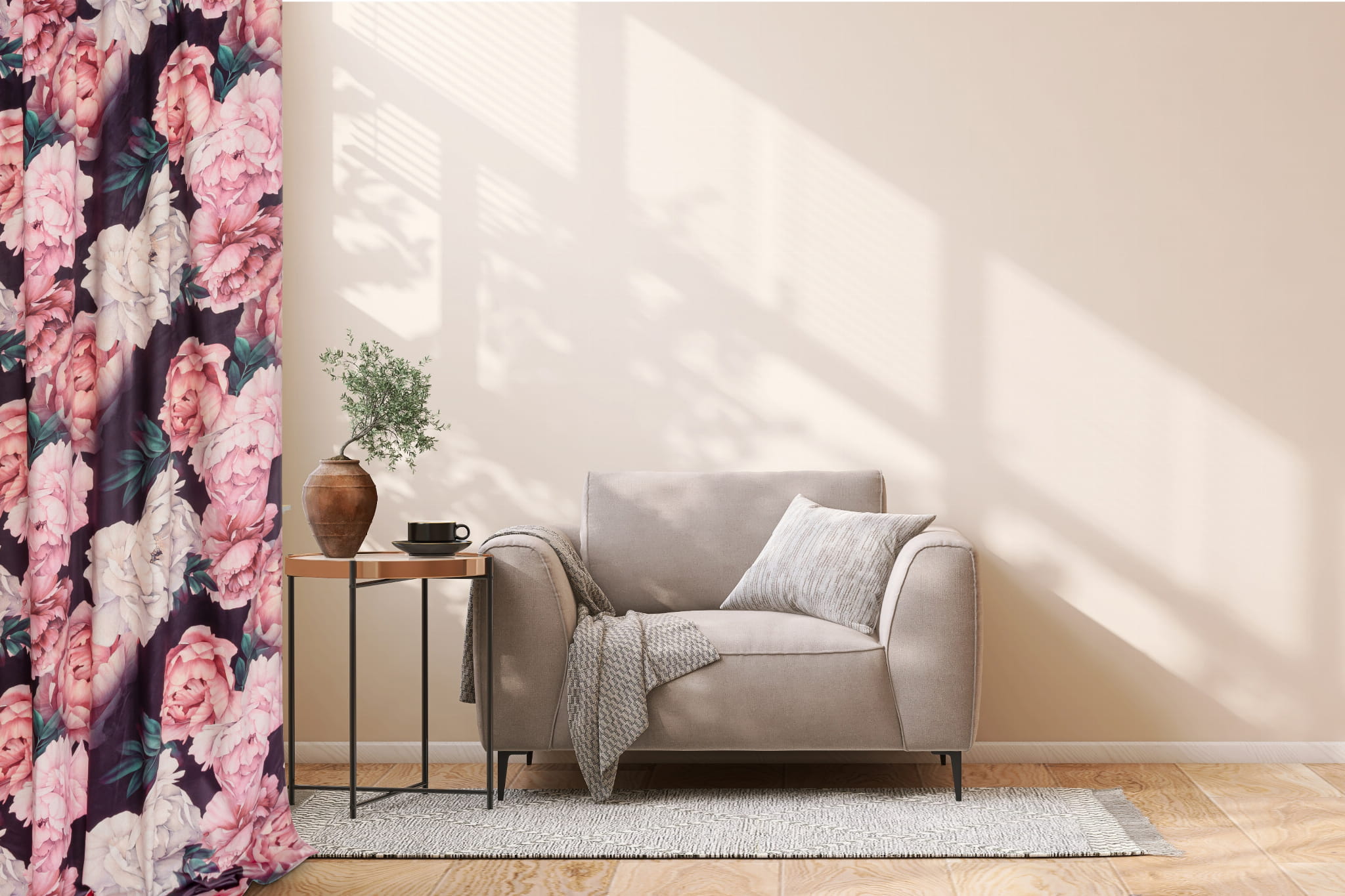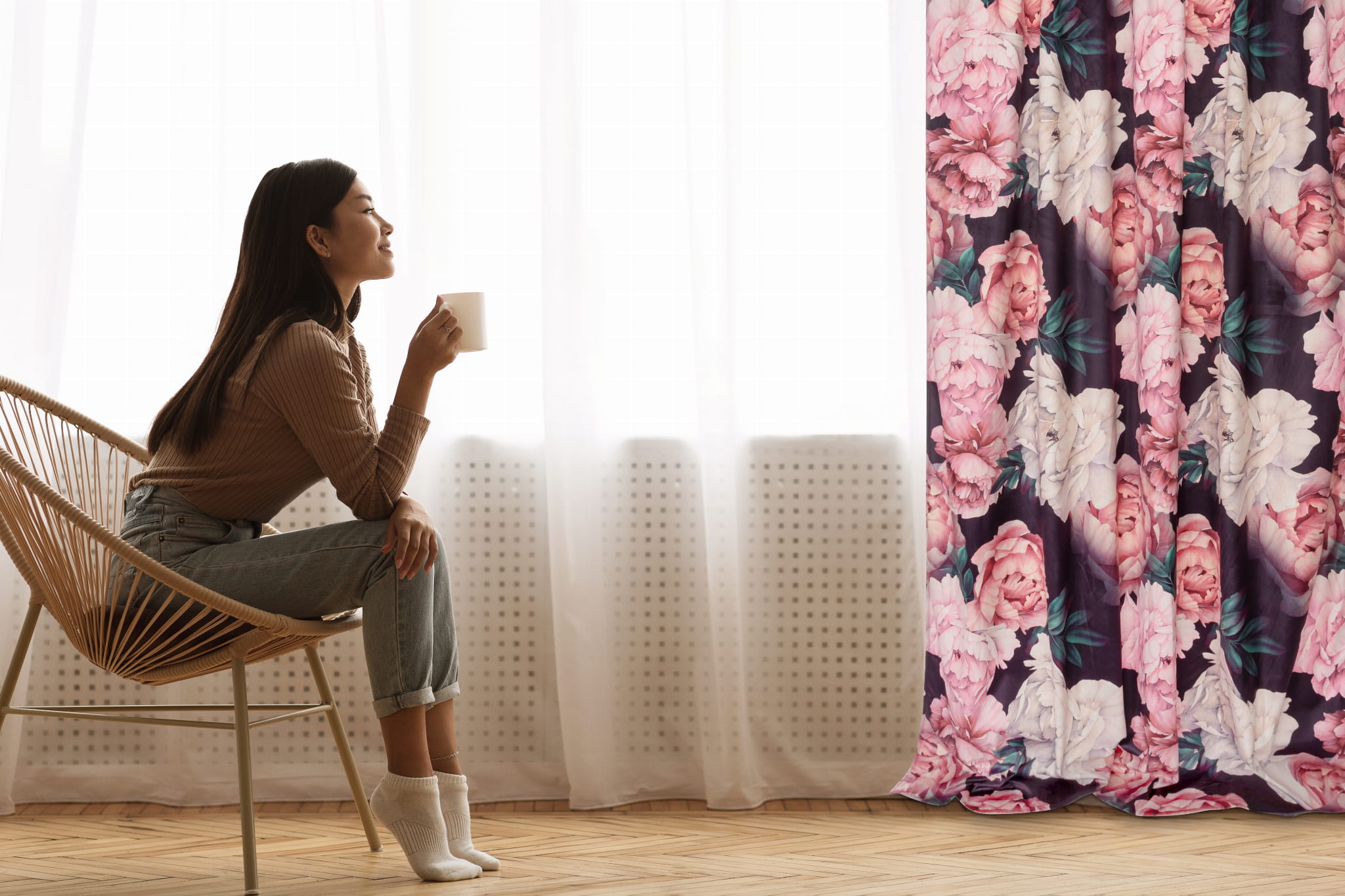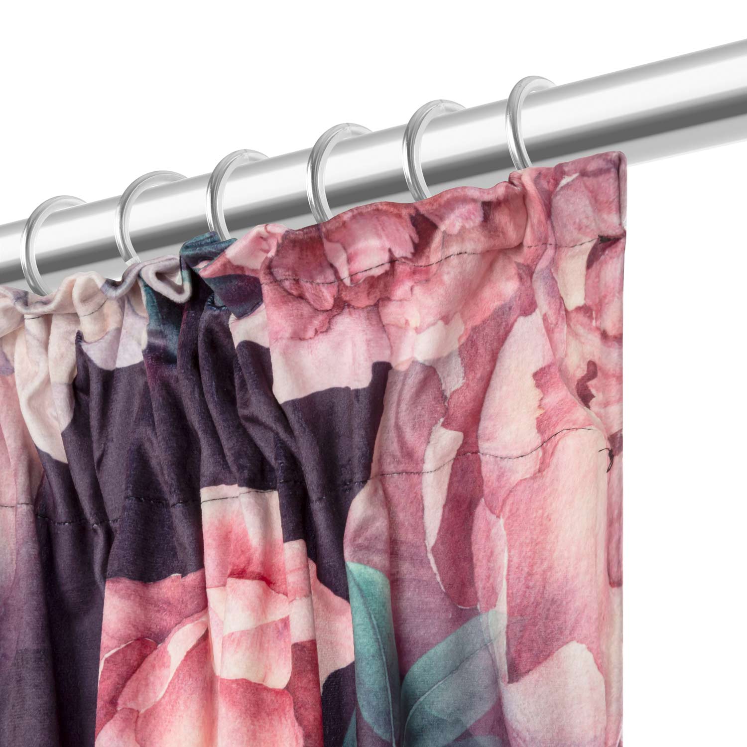 Zasłona w delikatny kwiatowy wzór doskonale wpasuje się do nowoczesnych wnętrz. Mocuje się ją na karniszu za pomocą wszytej taśmy. Taka konstrukcja sprawia, że można zastosować dowolną gęstość marszczenia.