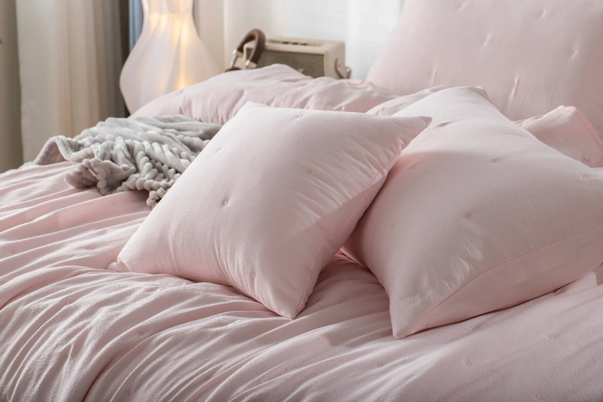 - Cosy Elegance – pudrowy z kremem, beżem i welurowymi poduszkami tworzy atmosferę przytulnej, eleganckiej sypialni.