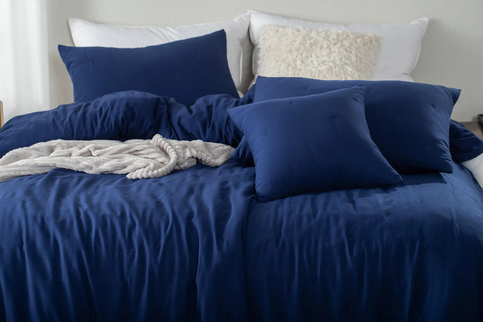 Szafirowa narzuta z haftem kropek z mikrofibry o delikatnie wypukłej, ziarnistej strukturze Dotta