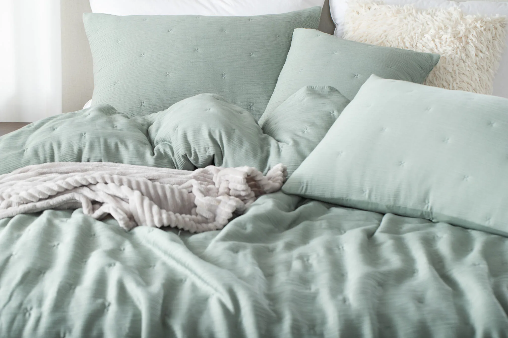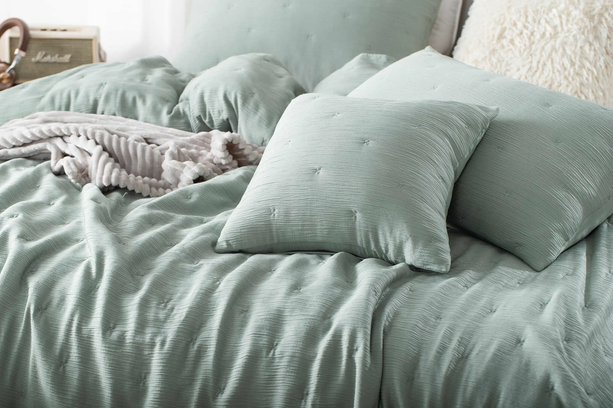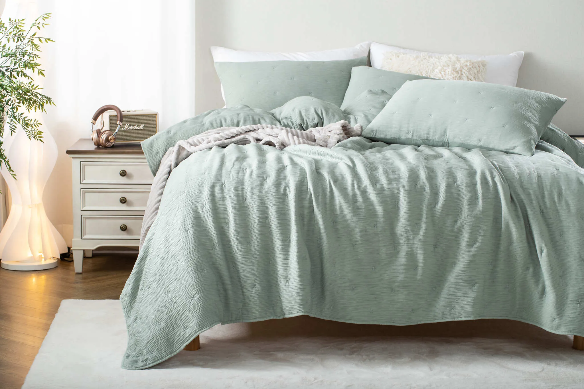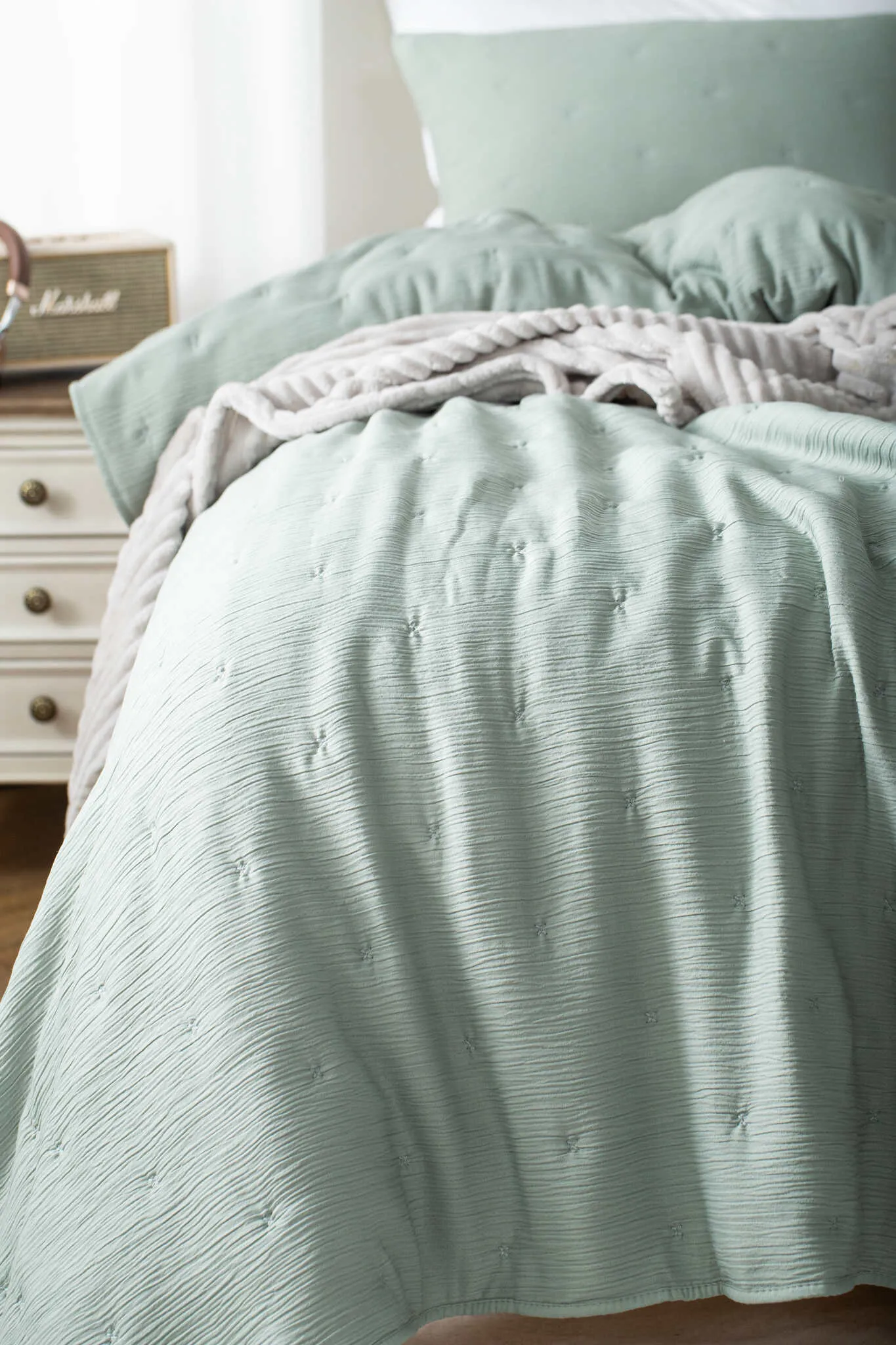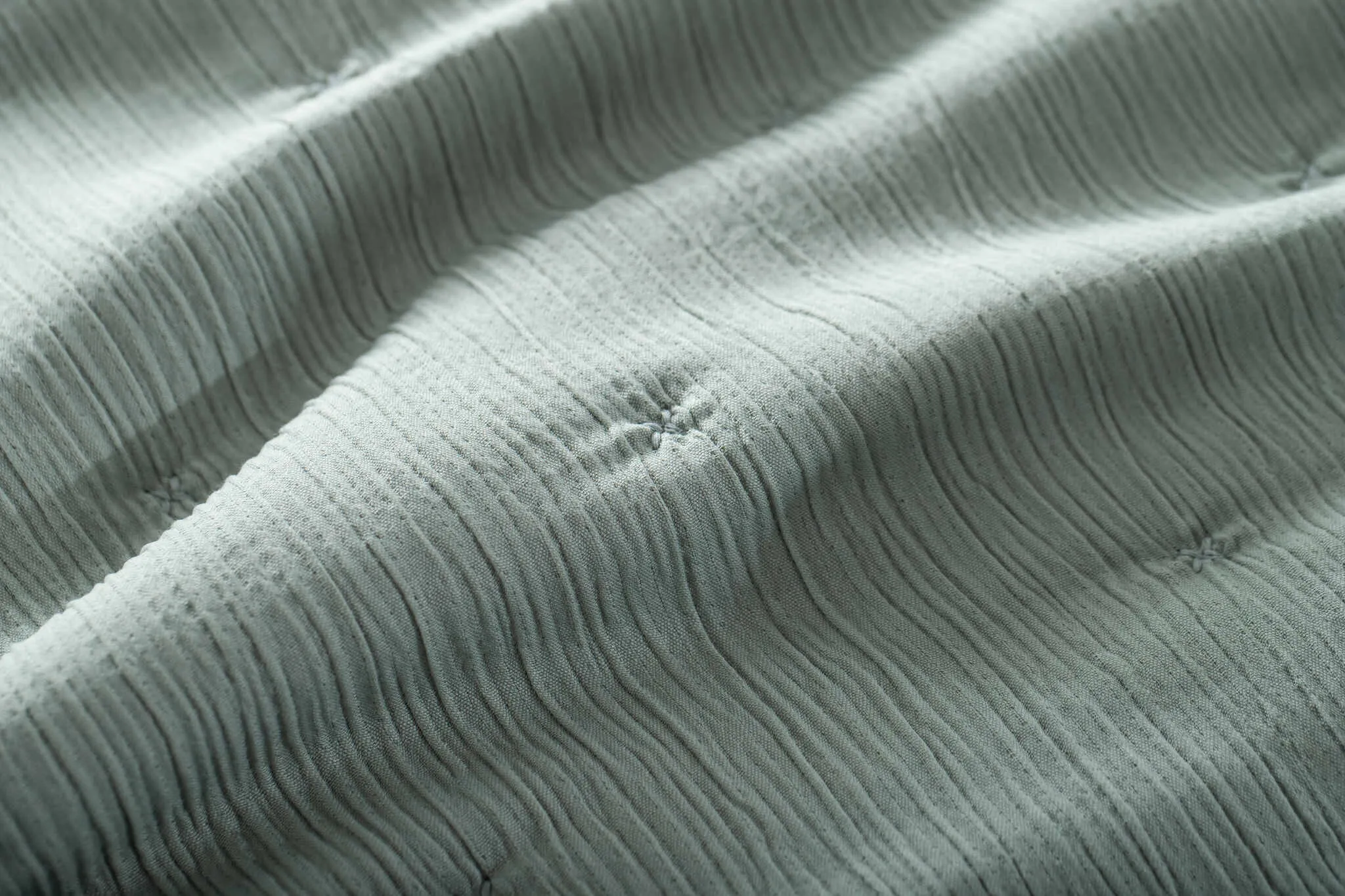 Szałwiowa narzuta na łóżko z muślinowym marszczeniem z mikrofibry Stella