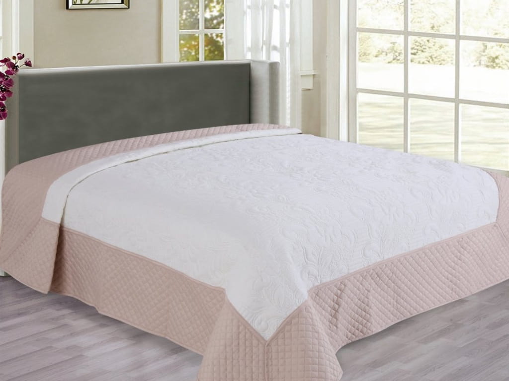 Narzuta pikowana w rozmiarze 220x240 cm (szerokość x długość) została wykonana z matowego materiału przypominającego bawełnę, składającego się ze 100% poliestru. Posiada estetyczne pikowanie tworzone metodą zgrzewania hot press, które jest zdecydowanie solidniejsze od tradycyjnego zszywania. Wykończono ją lamówką zabezpieczającą przed uszkodzeniami. Jest gładka i przyjemna w dotyku, a do tego nie jest śliska.